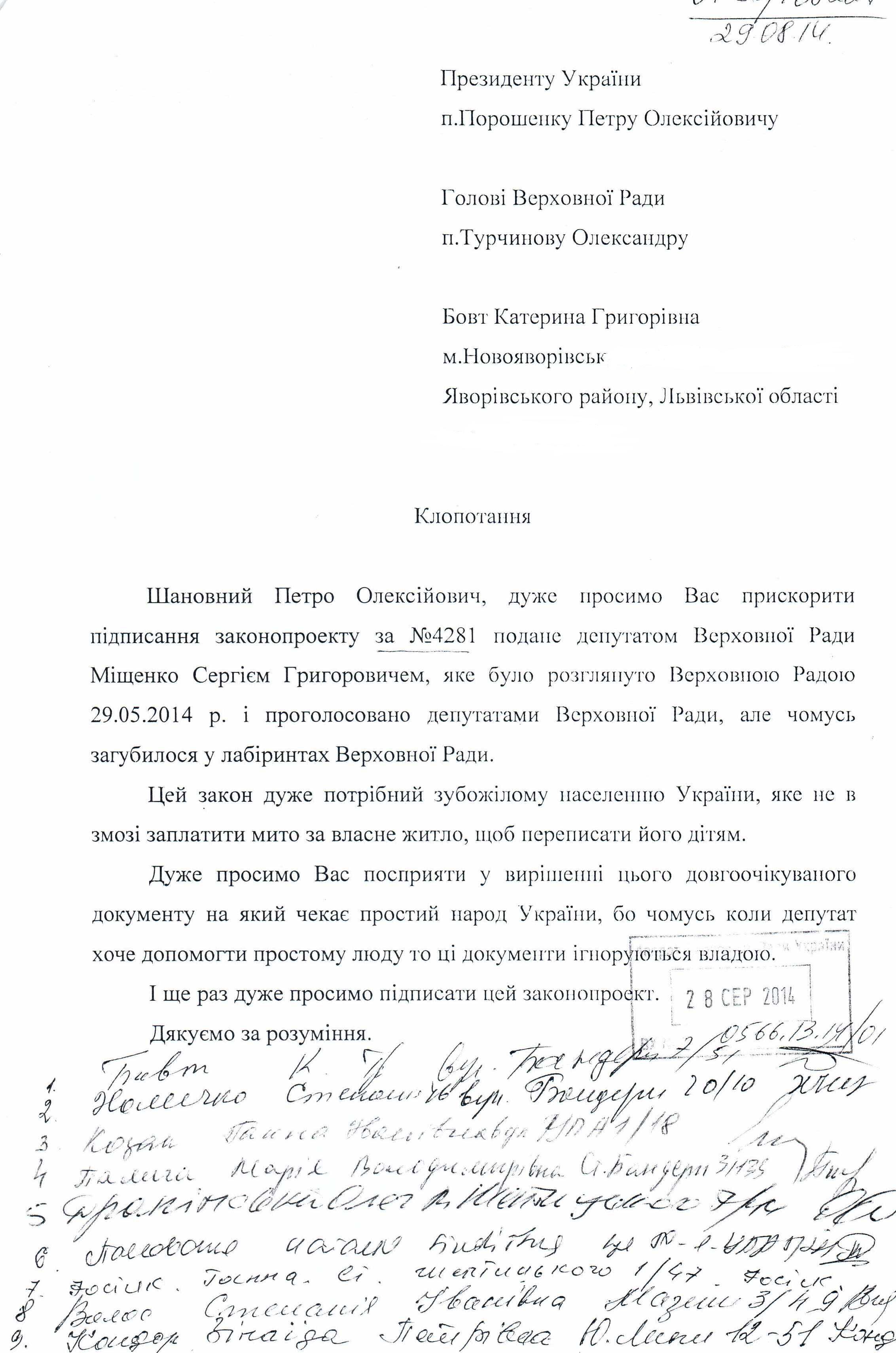 Головна > Верховна Рада України > Вхідна документація > Лист жителів міста Новоярівськ, Львівської області, щодо прискорення прийняття проекту Закону України “Про внесення змін до Податкового кодексу України (щодо оподаткування спадщини)”, реєстр. №4281