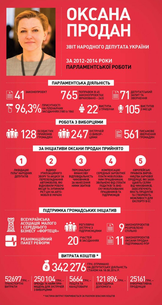 «В діючому парламенті дуже важко проходять реформаторські законопроекти. Тим не менше, частину ініціатив вдалося реалізувати. Зокрема, хотіла б відзначити один з останніх законів – про безпеку та якість харчових продуктів. Він відкриває ринки країн ЄС для українських виробників, ліквідує корупційні бар’єри і створює систему превентивного контролю за якістю продуктів протягом всього циклу «від лану до столу». Сподіваюся, новий склад Верховної Ради буде більше налаштований на реформи і нашій команді вдасться домогтися прийняти інших законопроектів, які зроблять Україну справжньою європейською країною з відповідним рівнем життя», – відзначила Оксана Продан, коментуючи попередні підсумки своєї роботи в парламенті сьомого скликання.