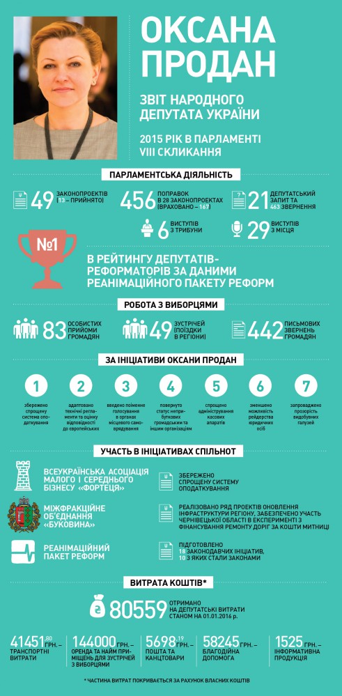 Народний депутат, голова Всеукраїнського об’єднання малого і середнього бізнесу «Фортеця» Оксана Продан оприлюднила звіт про роботу в Парламенті у 2015 році.