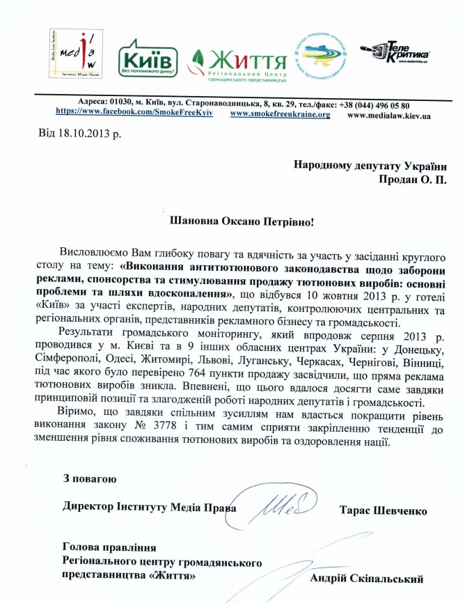 Вхідна документація > Подяка організаторів Круглого столу на тему: “Виконання антитютюнового законодавства щодо заборони реклами, спонсорства та стимулювання продажу тютюнових виробів: основні проблеми та шляхи вдосконалення” за участь у засіданні круглого столу