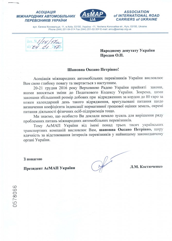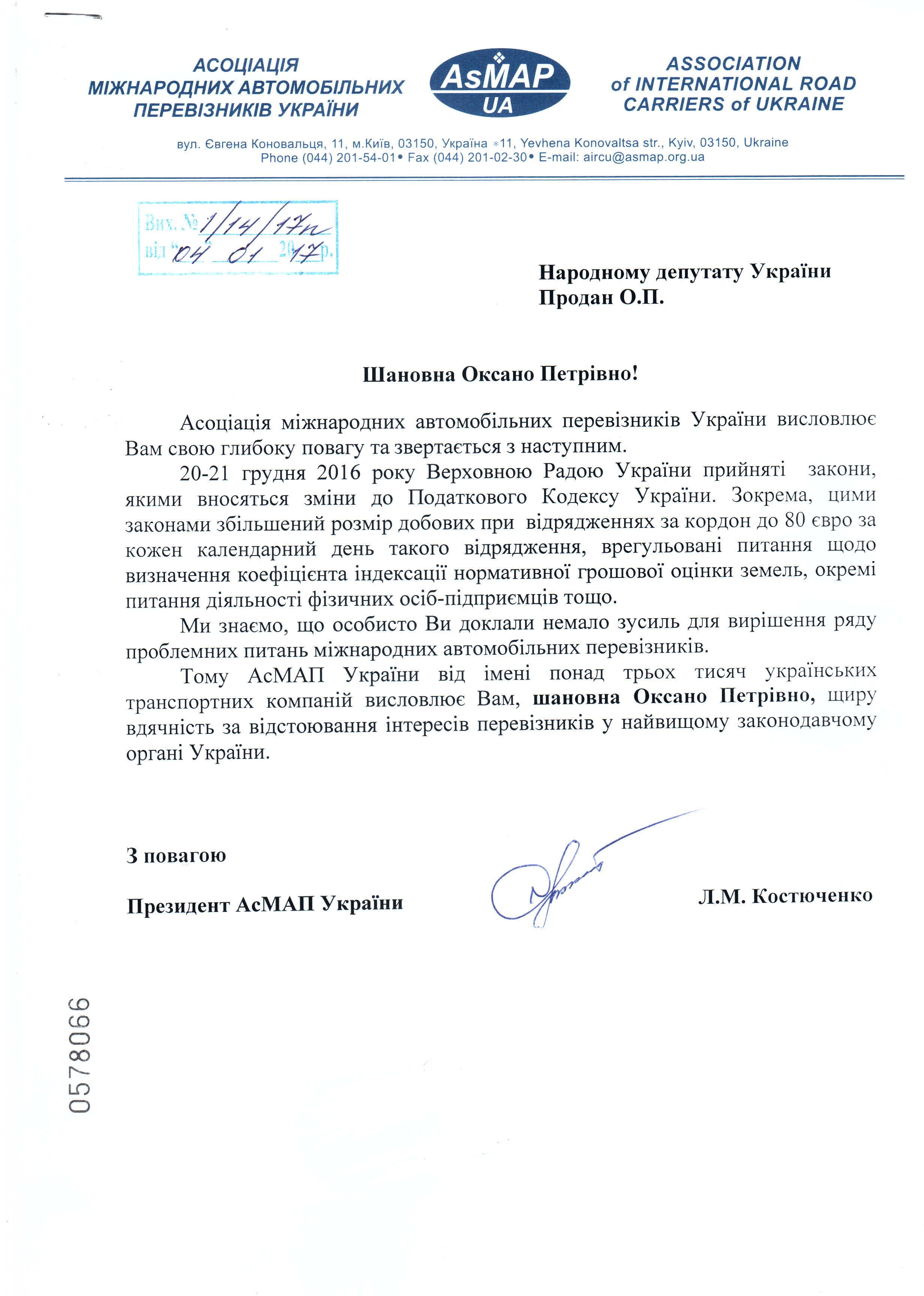 Подяка від АсМАП України за відстоювання інтересів перевізників