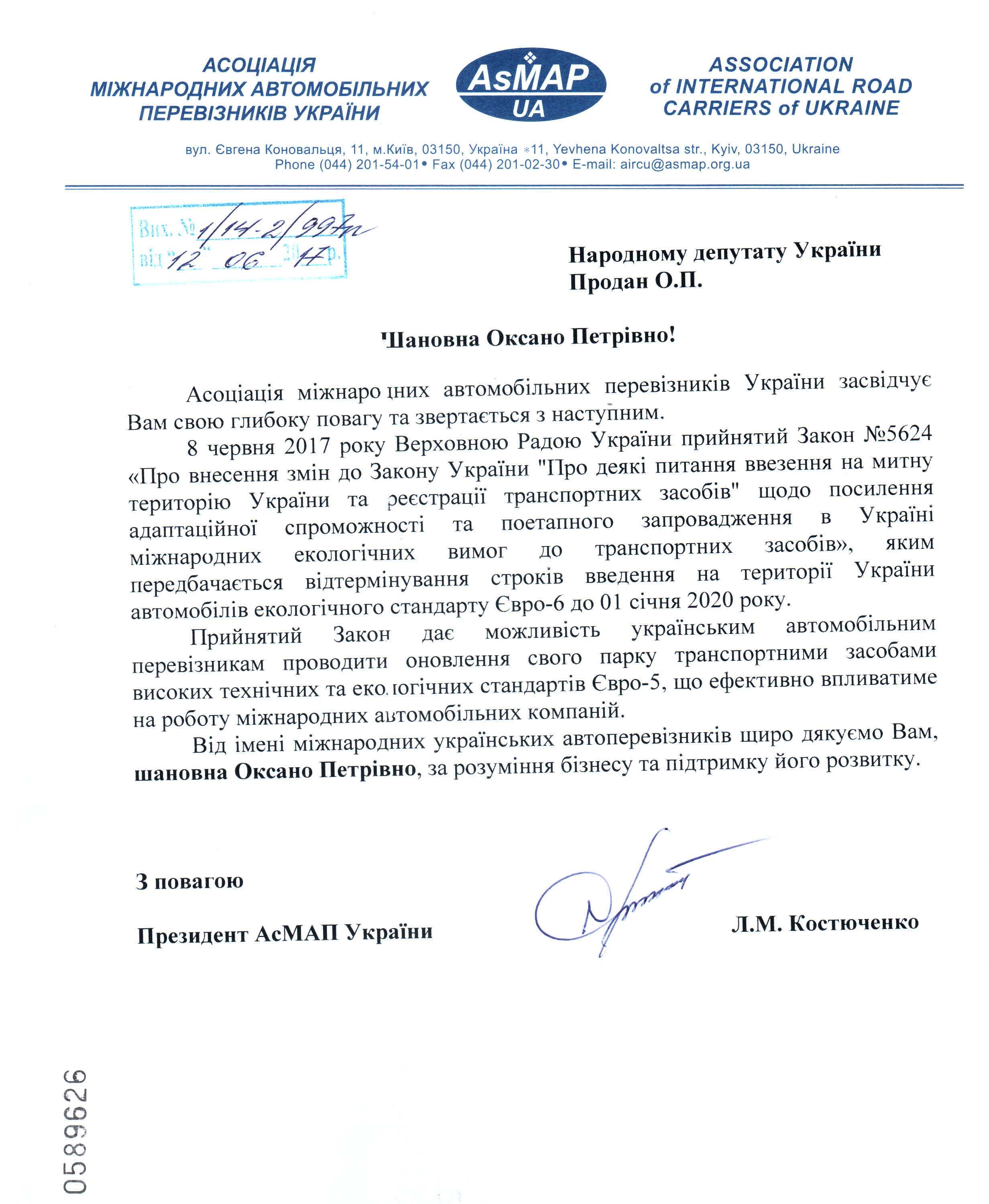 21Чер Коментування вимкнено Подяка від Асоціації міжнародних автомобільних перевізників України за підтримку законопоректу щодо відтермінування строків введення екологічного стандарту для автомобілів Євро-6, реєстр.