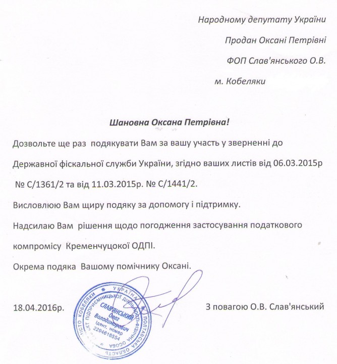 22Кві Коментування вимкнено Подяка від ФОП Слав’янський О.В. за допомогу у захисті законних прав суб’єкта господарювання
