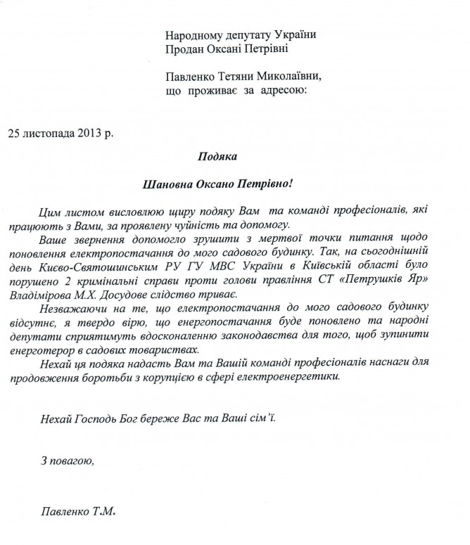 07Гру Коментування вимкнено Подяка за допомогу у вирішенні питання поновлення електропостачання до садового будинку