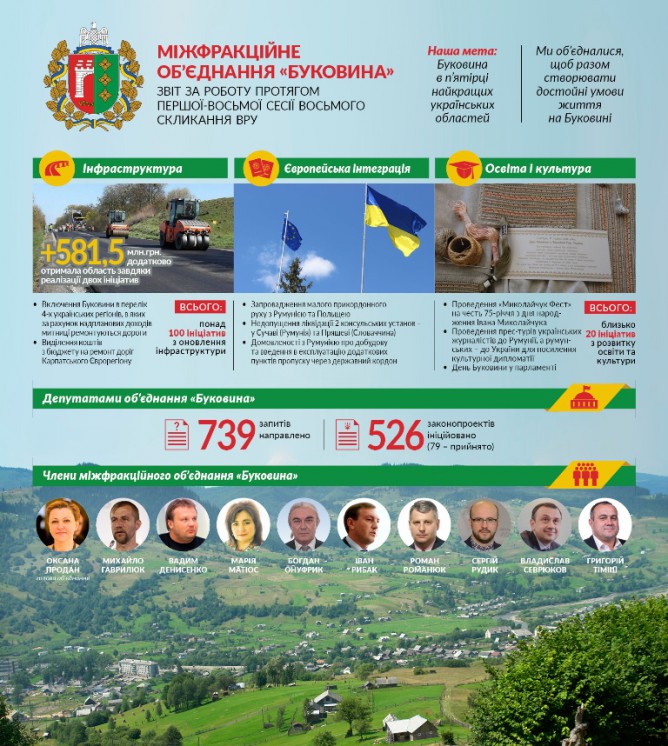 Також члени міжфракційного об’єднання «Буковини» домоглися виділення прямих субвенцій на оновлення інфраструктури регіону – дитячих садочків, шкіл, лікарень та інших об’єктів. Зокрема, влітку 2017 року місцеві бюджети Чернівецької області отримали субвенцію у сумі 30,7 млн. грн. В тому числі: 2,6 млн. грн. на ремонт Театральної площі в Чернівцях та 1,3 млн. грн. на закупівлю обладнання і ремонт санітарних кімнат Чернівецької міської клінічної лікарні №3. Додатково завдяки зусиллям членів об’єднання «Буковина» було виділено майже 5 млн. грн. на придбання двох мультифункціональних комунальних всесезонних машин, а також 5 млн. грн. на ремонт ділянки дороги Т-62 «Підзахаричі – Розтоки».
