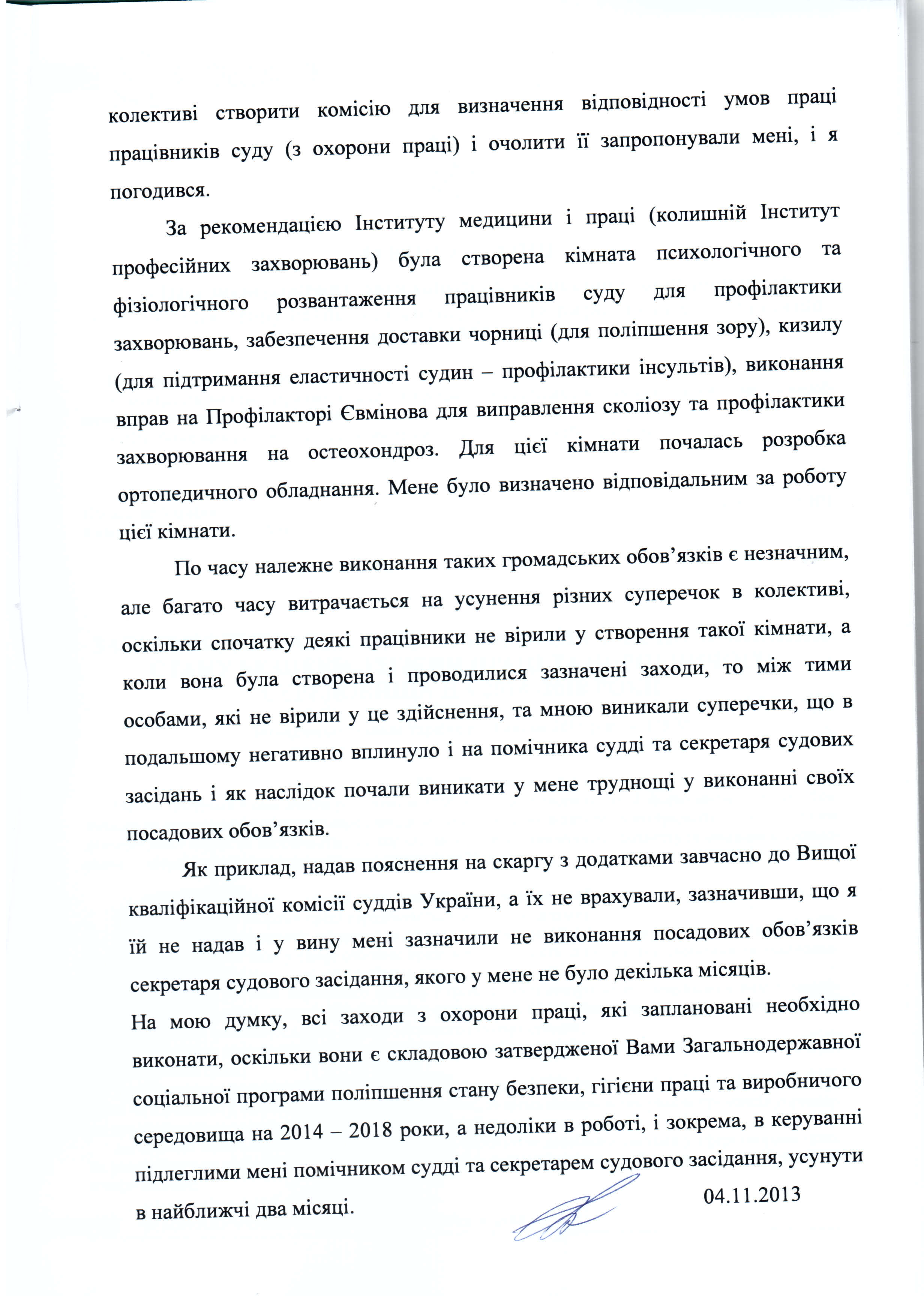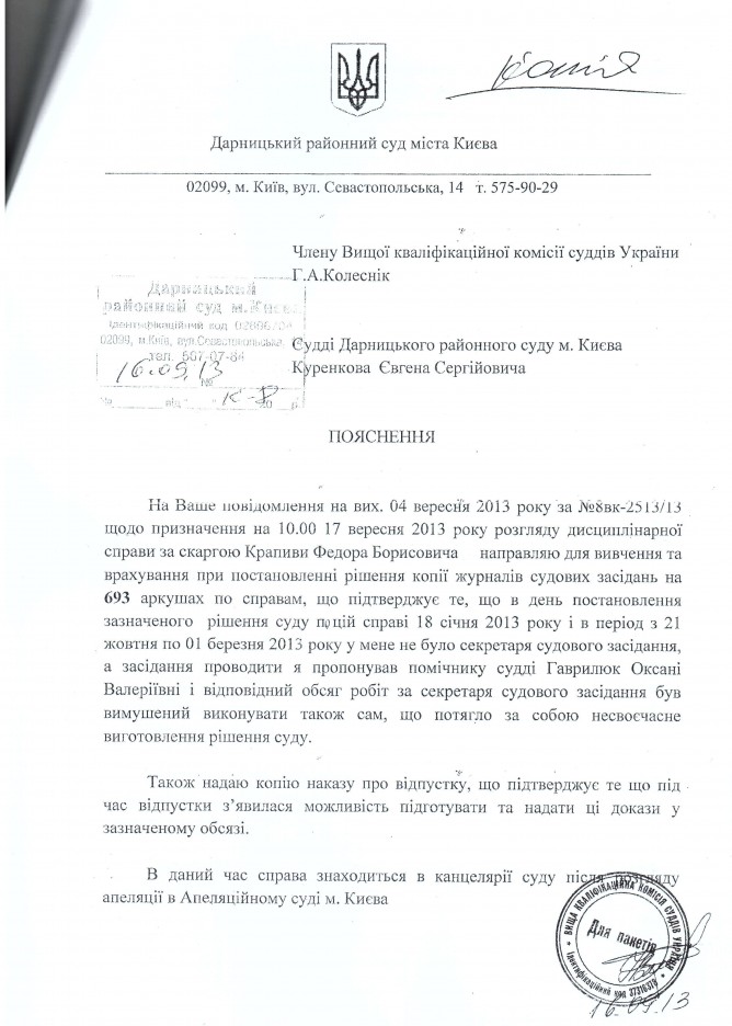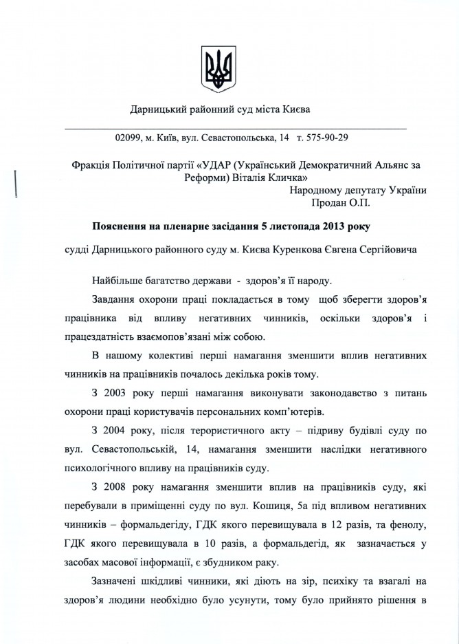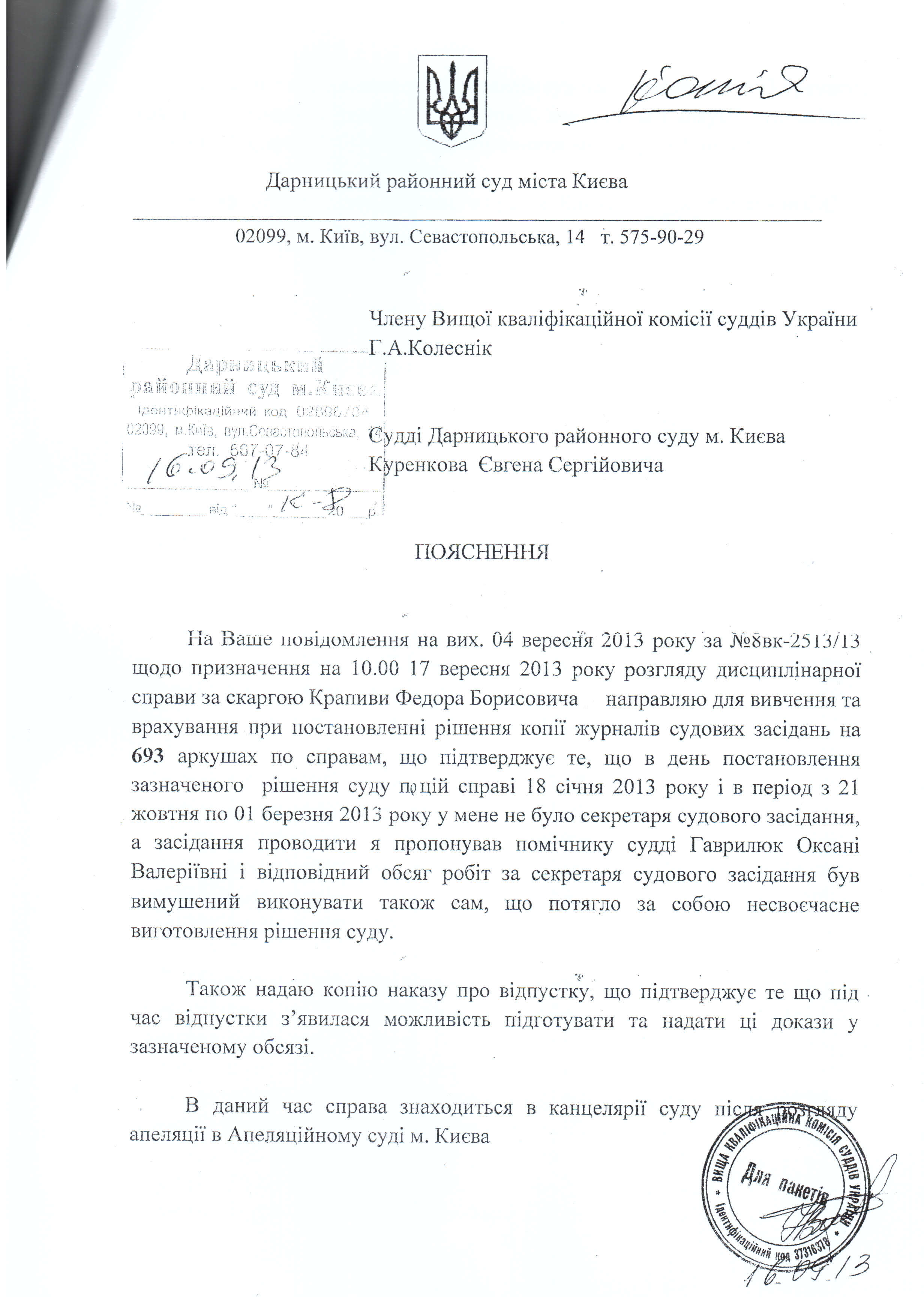 21Лис Коментування вимкнено Пояснення судді Дарницького районного суду м. Києва на пленарне засідання 05.11.2013 р., на якому розглядалося питання про його звільнення