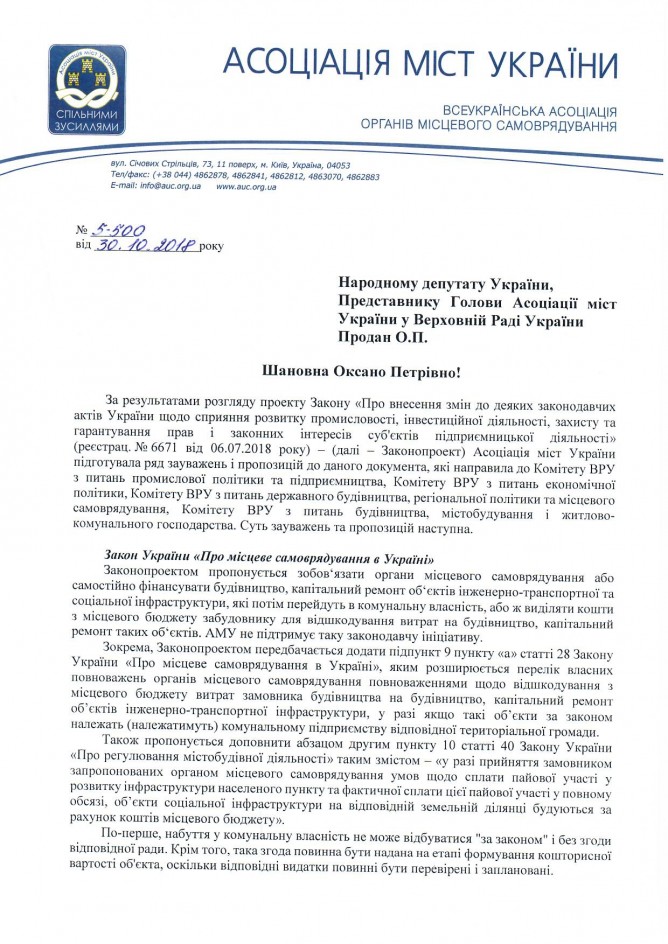 Вхідна документація > Пропозиції Асоціації міст України до законопроекту “Про внесення змін до деяких законодавчих актів України щодо сприяння розвитку промисловості, інвестиційної діяльності, захисту та гарантування прав і законних інтересів суб’єктів підприємницької діяльності”, реєстр. №6671