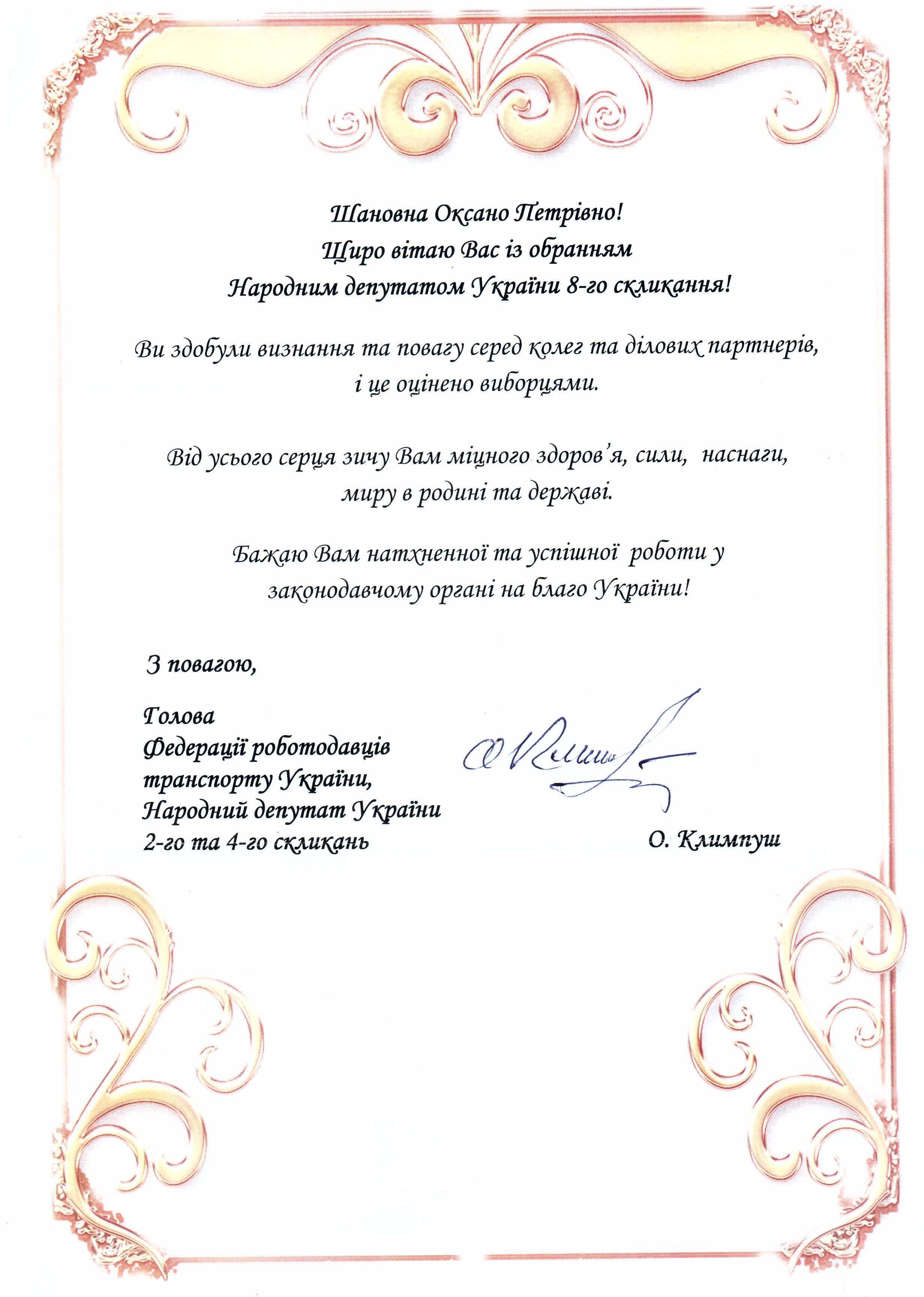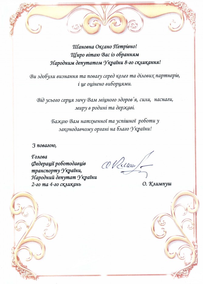 Головна > Верховна Рада України > Вхідна документація > Привітання від Федерації роботодавців транспорту України з нагоди обрання народним депутаттом України VIII скликання