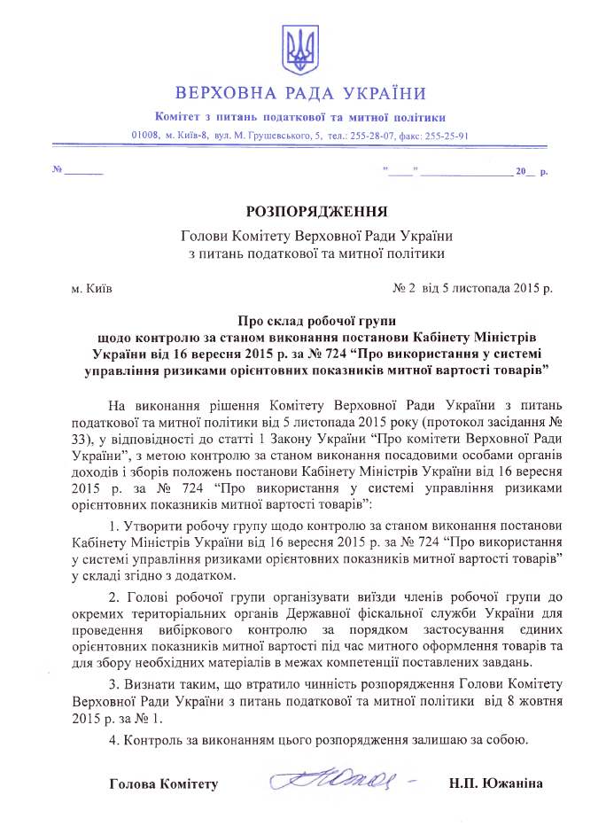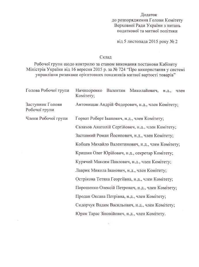 Розпорядження Голови Комітету ВРУ з питань податкової та митної політики “Про склад робочої групи щодо контролю за станом виконання постанови КМУ від 16.09.2015 р. №724 “Про використання у системі управління ризиками орієнтовних показників митної вартості товарів”
