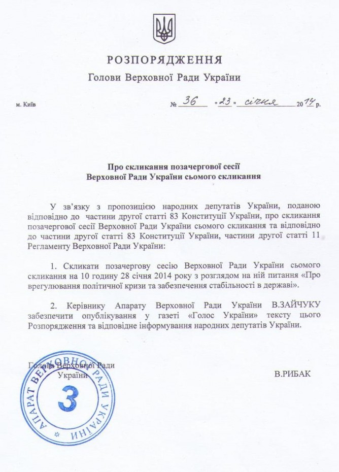 24Січ Коментування вимкнено Розпорядження Голови Верховної Ради України “Про скликання позачергової сесії Верховної Ради України сьомого скликання” від 23.01.2014 р.