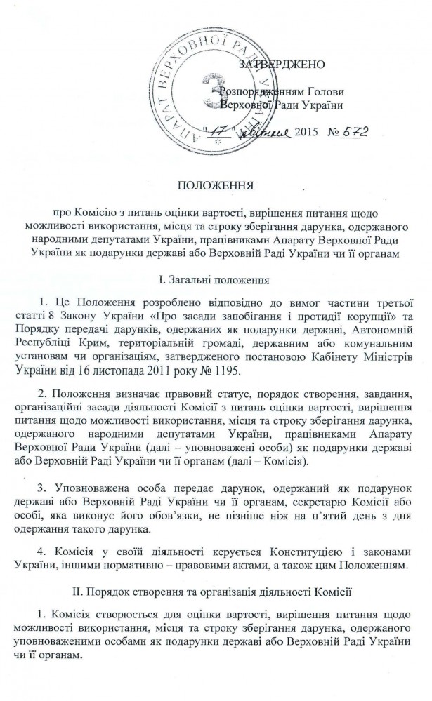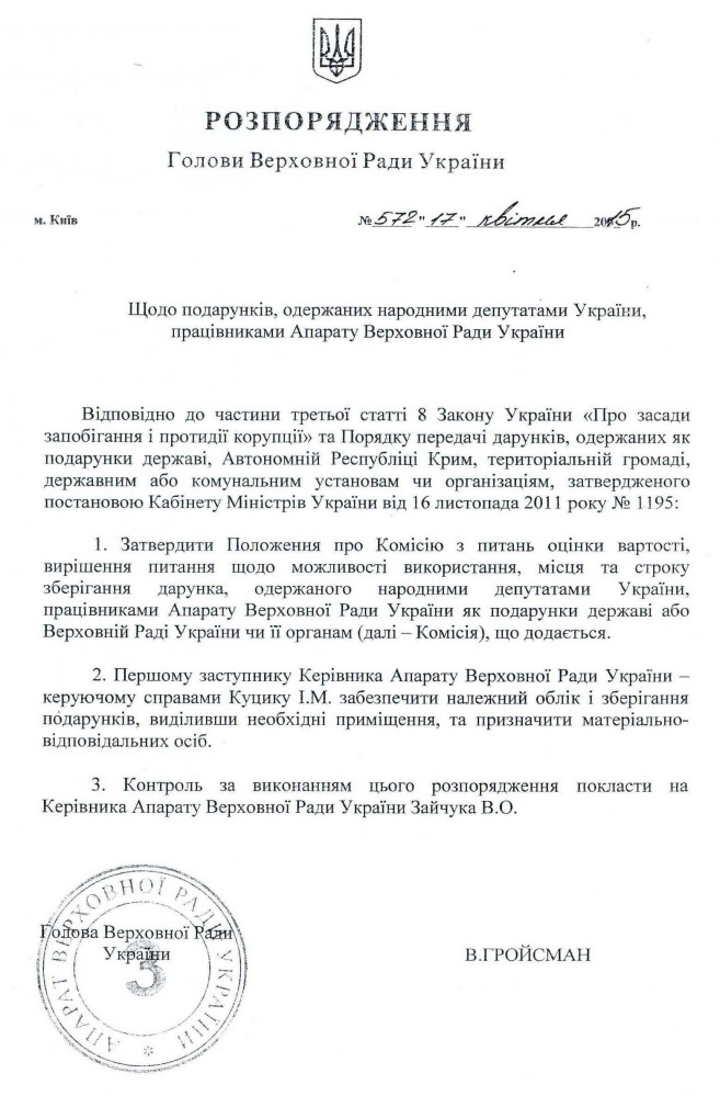 12Тра Коментування вимкнено Розпорядження Голови ВРУ “Щодо подарунків, одержаних народними депутатами України, працівниками Апарату ВРУ”