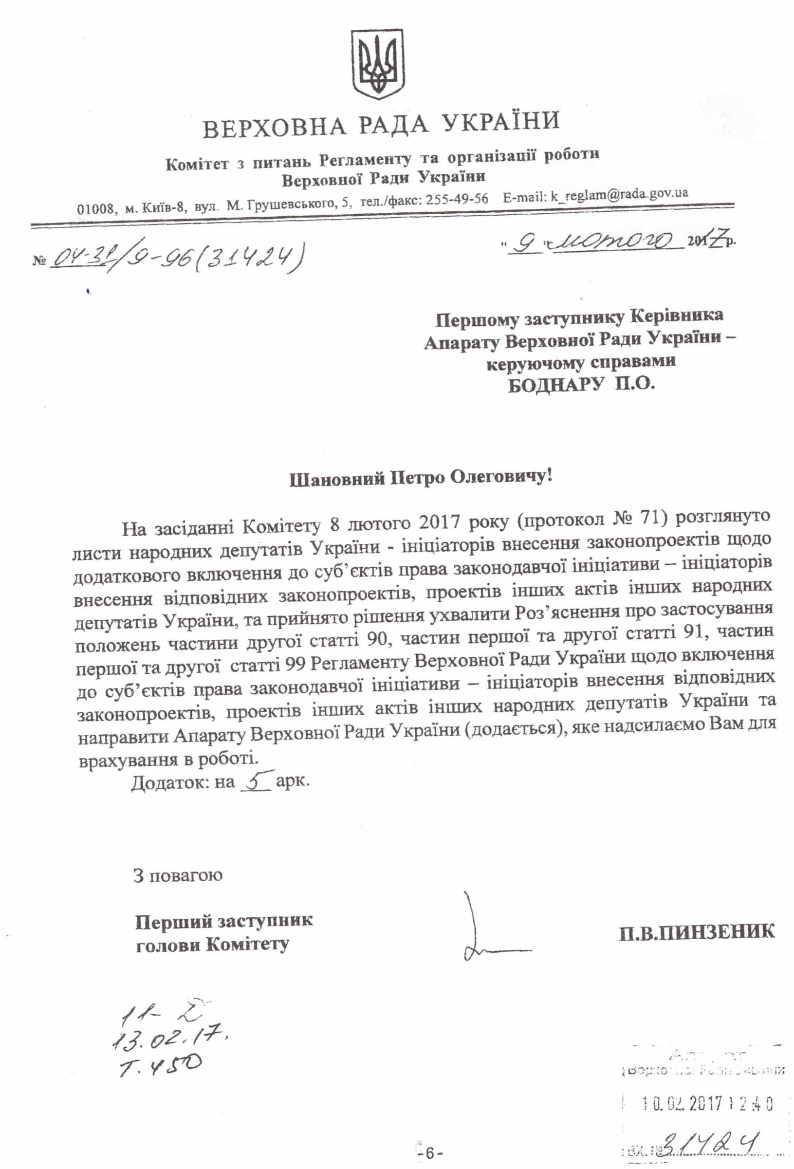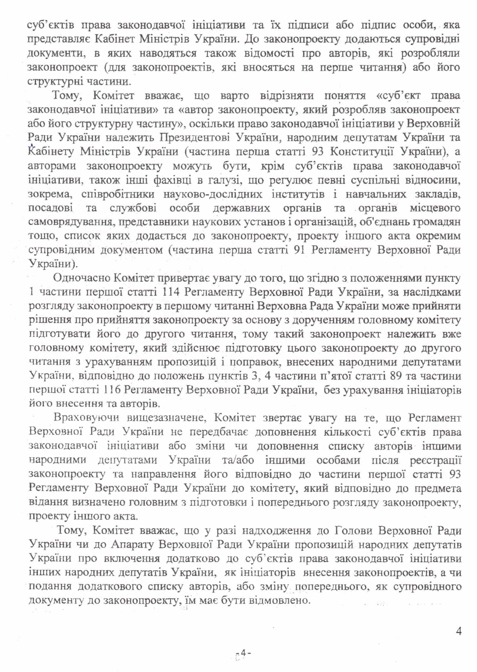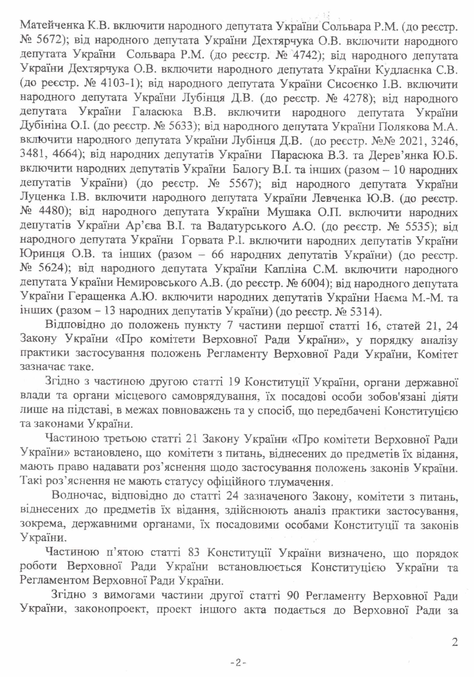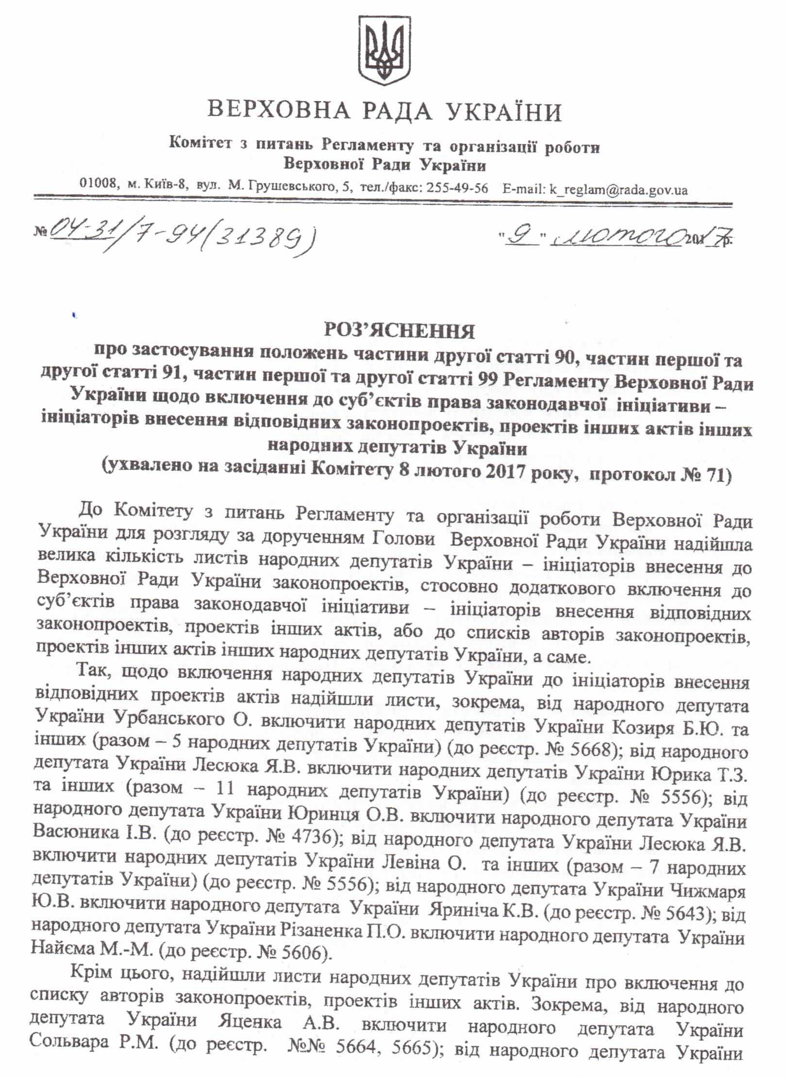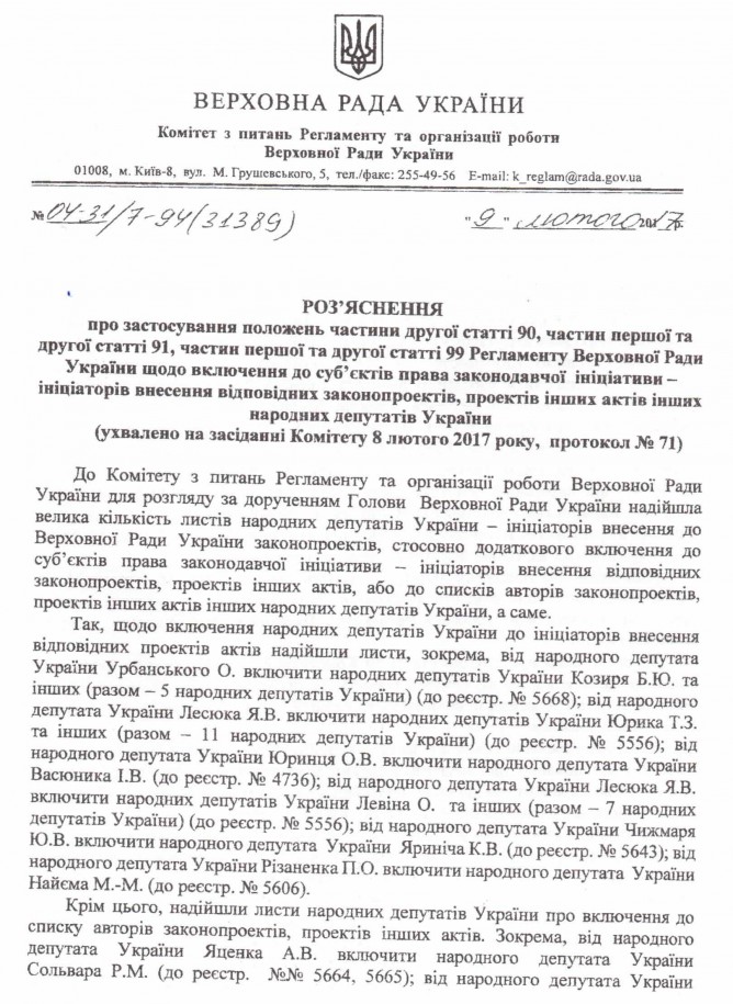 Вхідна документація > Роз’яснення Комітету ВРУ з питань Регламенту та організаційної роботи ВРУ щодо застосування положень Регламенту ВРУ в частині включення до суб’єктів права законодавчої ініціативи інших народних депутатів України