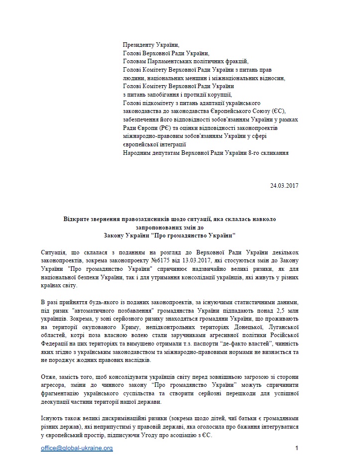 30Бер Коментування вимкнено Відкрите звернення правозахисників щодо ситуації, яка склалася навколо запропонованих змін до Закону України “Про Громадянство України” АНАЛІТИЧНІ МАТЕРІАЛИ