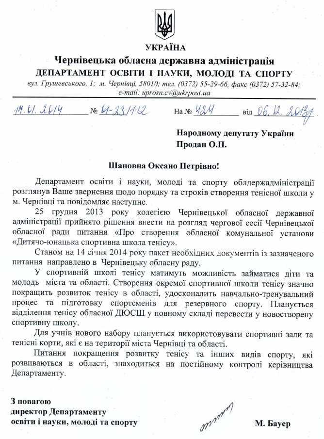 04Лют Коментування вимкнено Відповідь Чернівецької ОДА на депутатське звернення щодо порядку та строків створення окремої тенісної школи у м. Чернівці ДЕПУТАТСЬКЕ ЗВЕРНЕННЯ