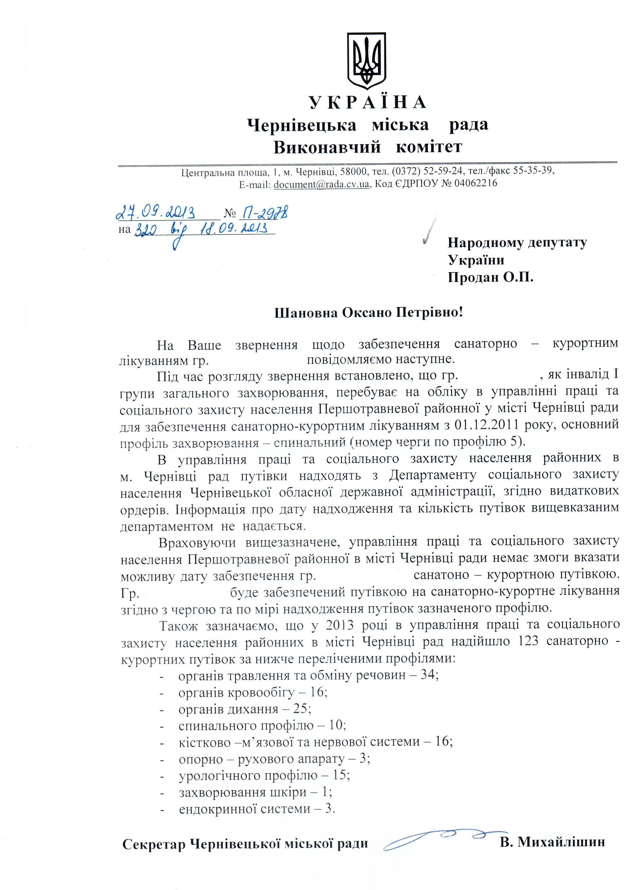 Вхідна документація > Відповідь Чернівецької міської ради щодо можливої дати забезпечення путівкою інваліда І-ої групи та надання інформації про кількість отриманих протягом 2013 року безкоштовних путівок на санаторно-курортне лікування