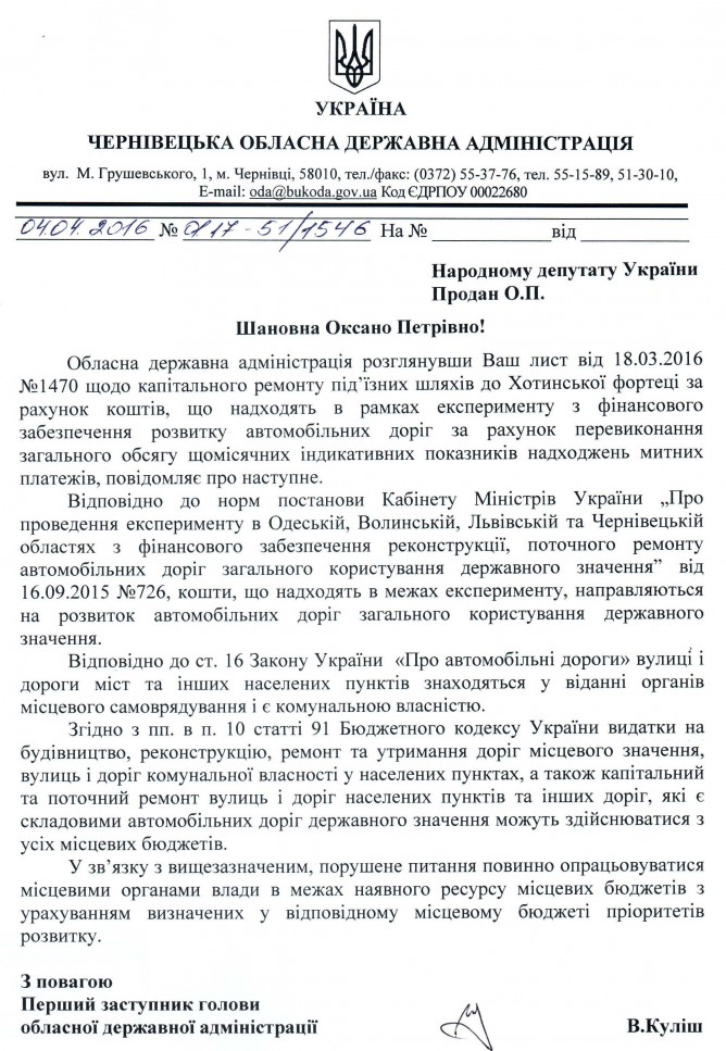 04Тра Коментування вимкнено Відповідь Чернівецької ОДА на депутатське звернення щодо капітального ремонту під’їзних шляхів до Хотинської фортеці ДЕПУТАТСЬКЕ ЗВЕРНЕННЯ