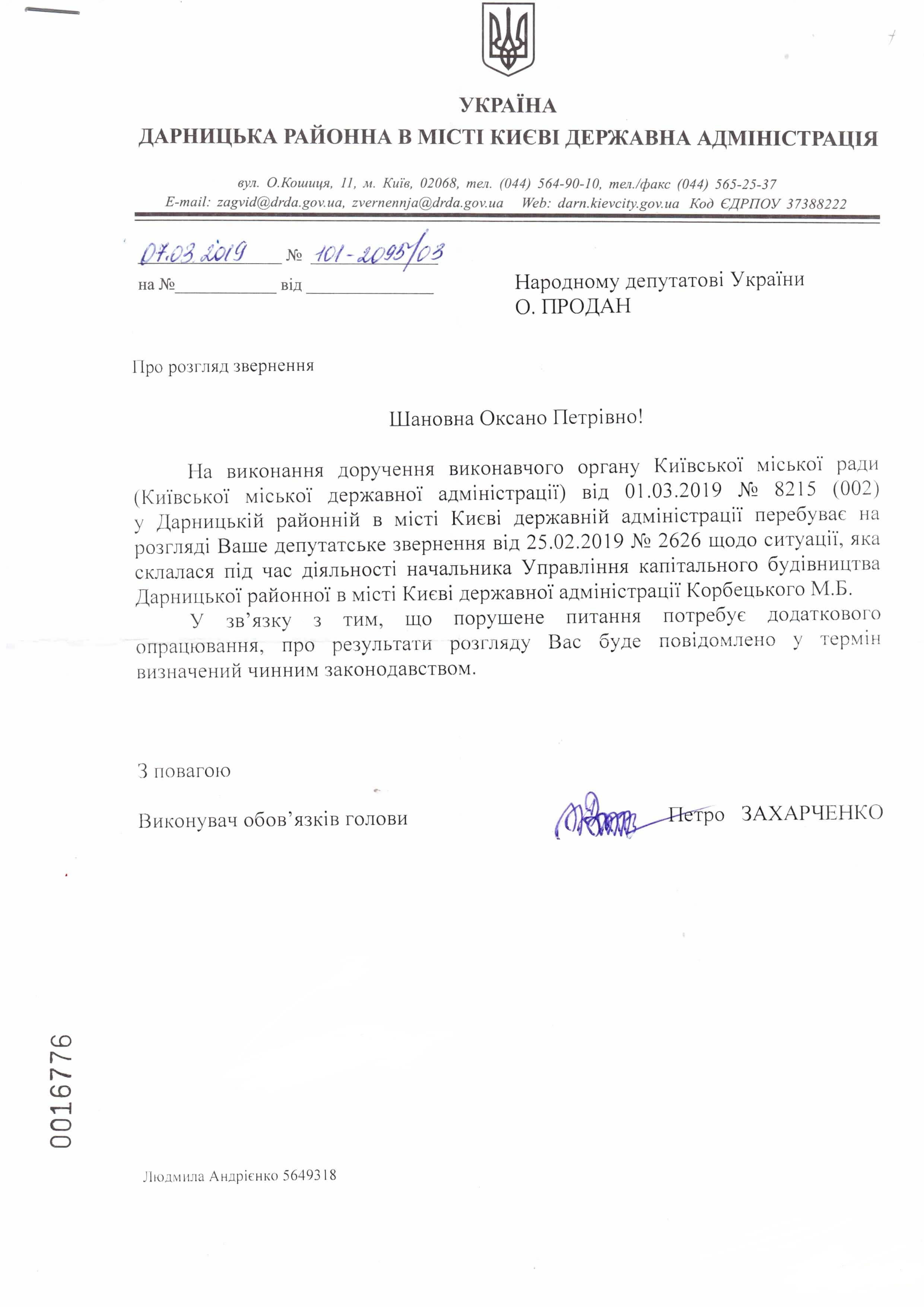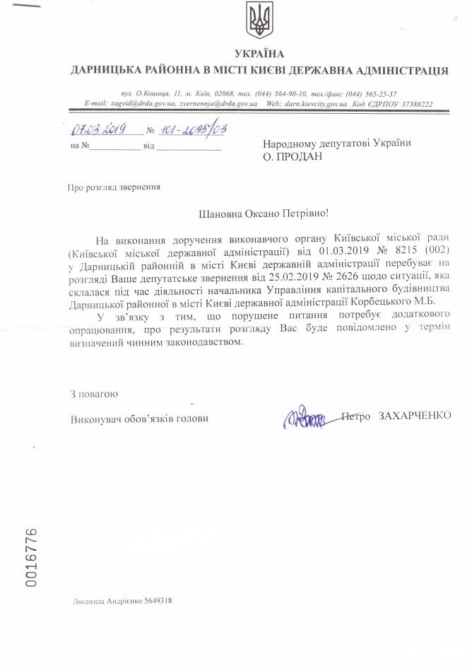 Відповідь Дарницької районної в м. Києві державної адміністрації на депутатське звернення щодо можливого порушення законодавства посадовими особами Дарницької РДА в м. Києві