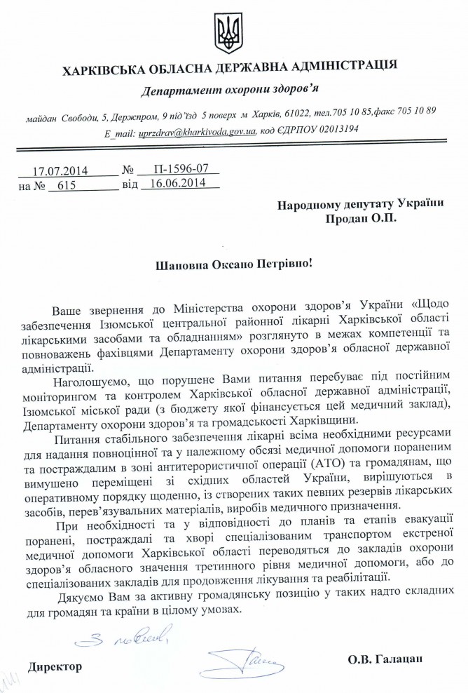 19Сер Коментування вимкнено Відповідь Депаратменту охорони здоров’я Харківської ОДА щодо забезпечення Ізюмської центральної районної лікарні Харківської області лікарськими засобами та обладнанням ДЕПУТАТСЬКЕ ЗВЕРНЕННЯ