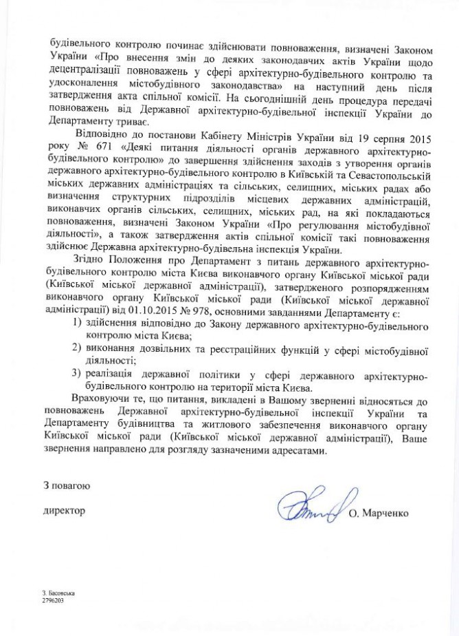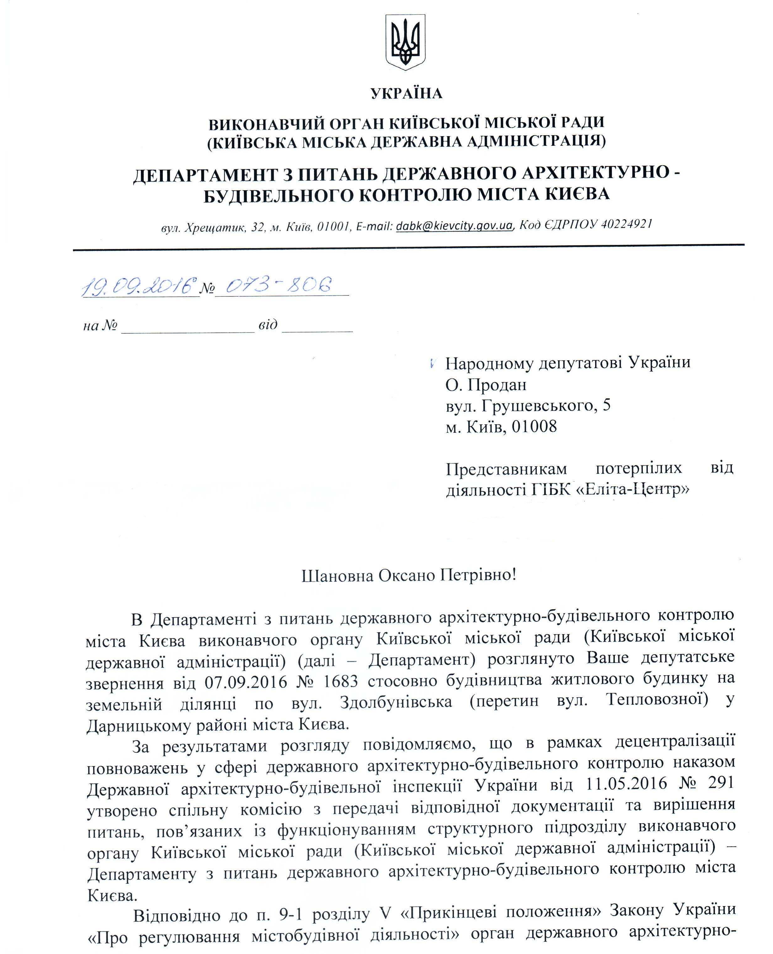 Відповідь Департаменту КМДА з питань державного архітектурно-будівельного контролю міста Києва на депутатське звернення щодо будівництва житлового будинку по вул. Здолбунівській в м. Києві