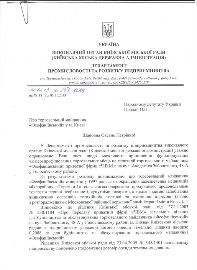 15Лис Коментування вимкнено Відповідь Департаменту промисловості та розвитку підприємництва Київської міської державної адміністрації щодо діяльності торговельних майданчиків “Феофанівський” у м. Києві ДЕПУТАТСЬКЕ ЗВЕРНЕННЯ