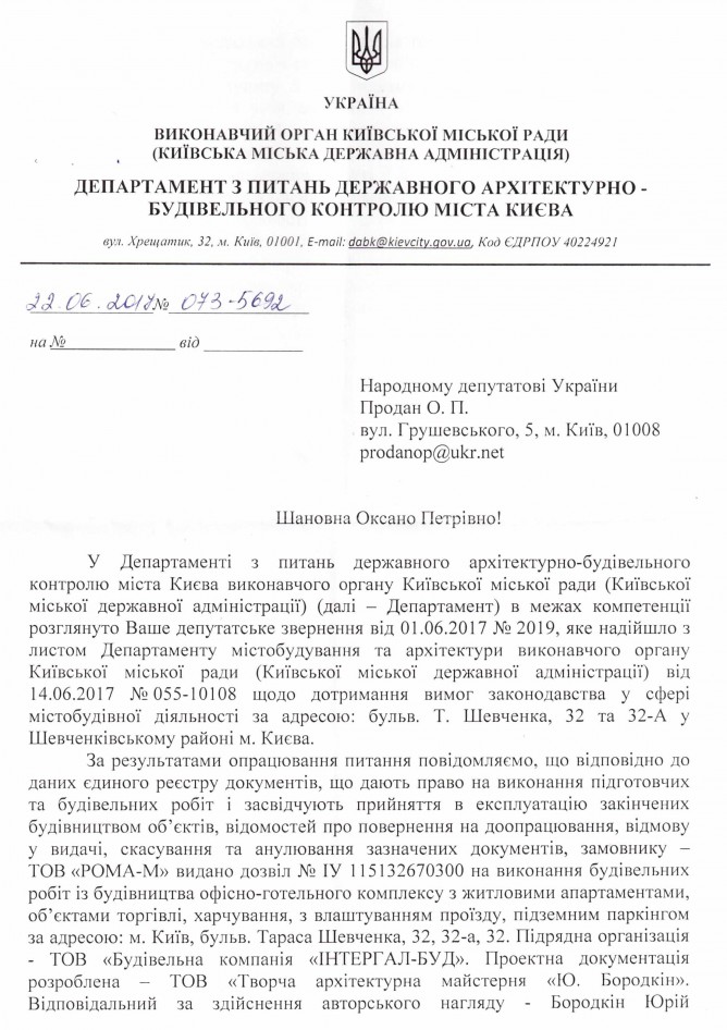 Вхідна документація > Відповідь Департаменту з питань державного архітектурно-будівельного контролю м. Києва виконавчого органу Київської міської ради (КМДА) на депутатське звернення щодо недопущення руйнування Міської садиби на бульварі Т.Шевченка, 34