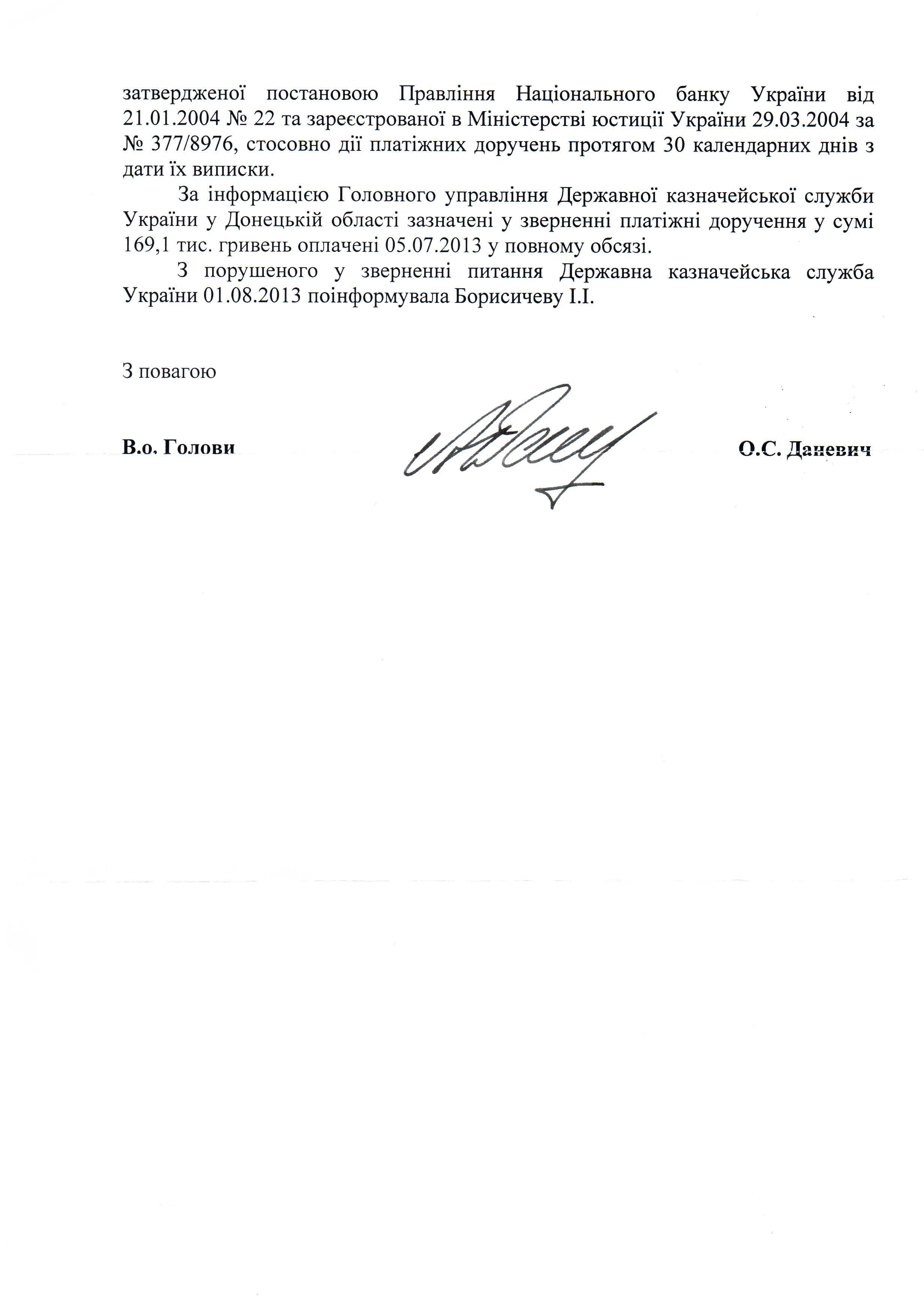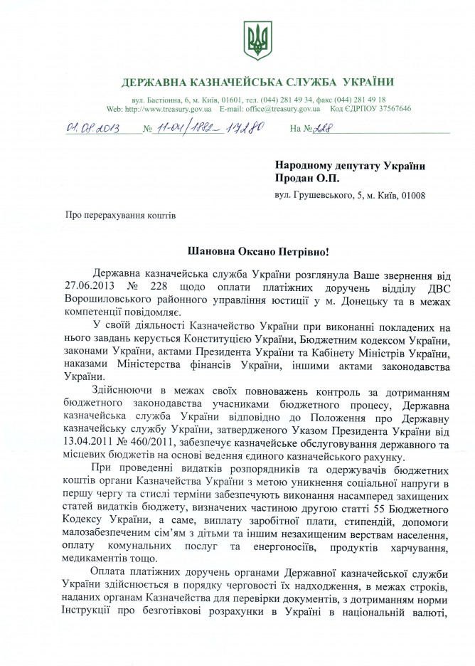 Відповідь Державного казначейства України на депутатське звернення щодо невиконання Головним управлінням Державної казначейської служби України у Донецькій області платіжних доручень відділу ДВС Ворошиловського районного управління юстиції у м. Донецьку