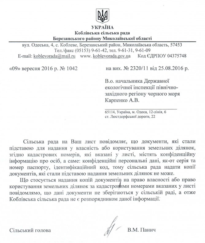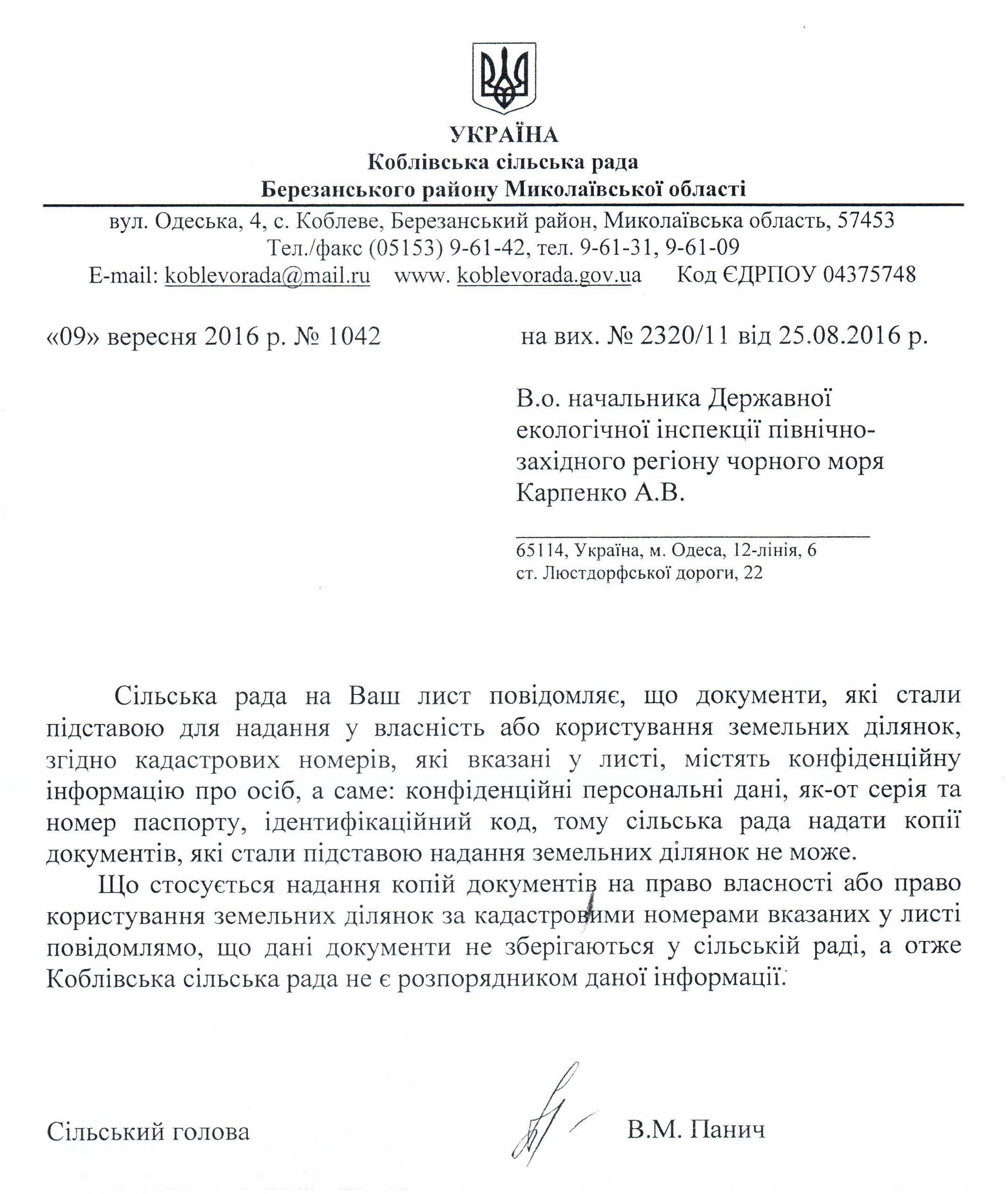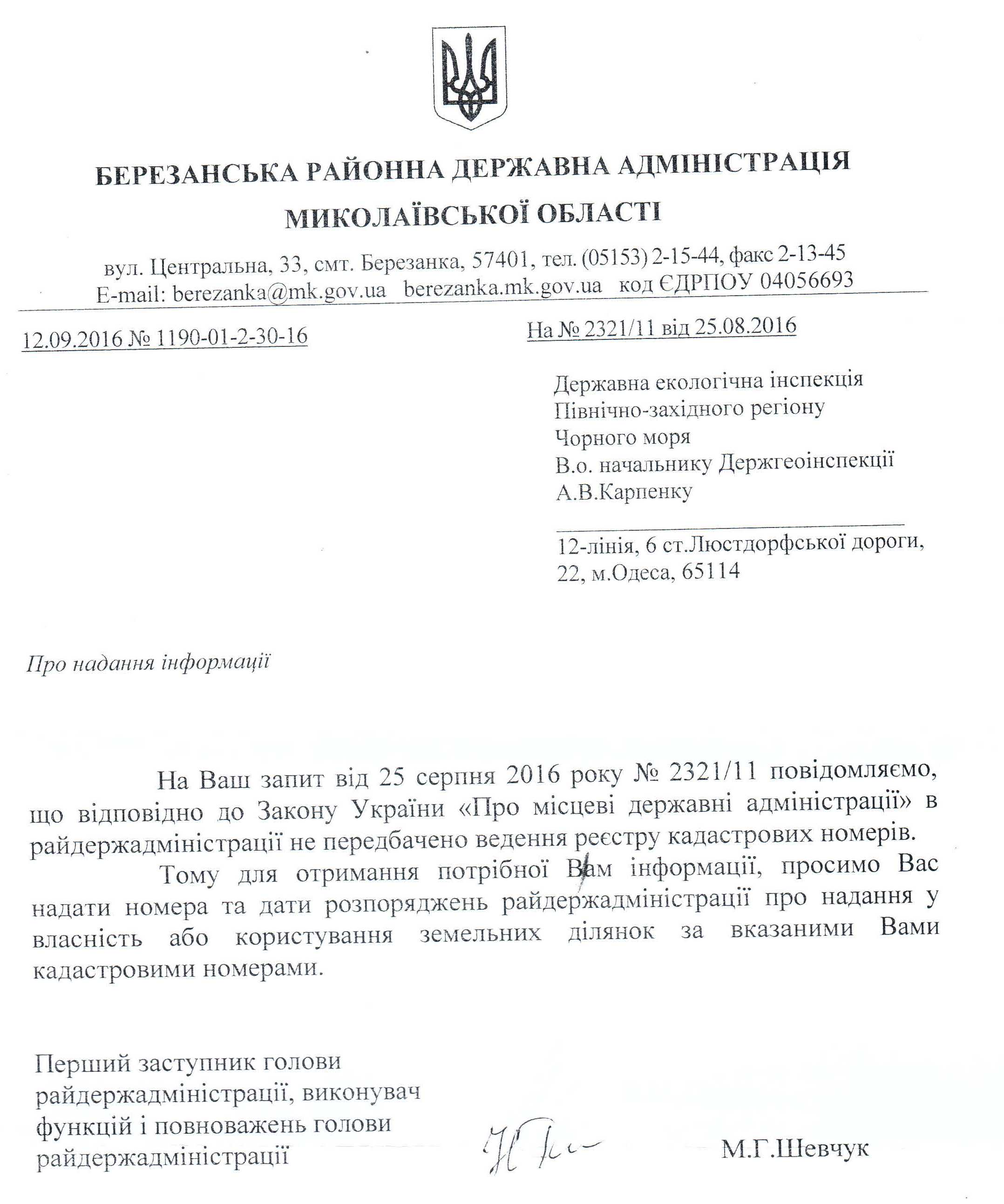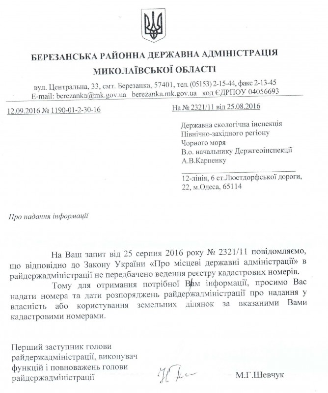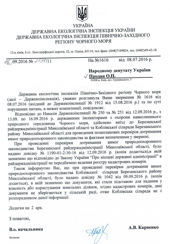 Вхідна документація > Відповідь Державної екологічної інспекції Північно-Західного регіону Чорного моря на депутатське звернення щодо можливих порушень земельного законодавства при передачі земельних ділянок у користування у Миколаївській області