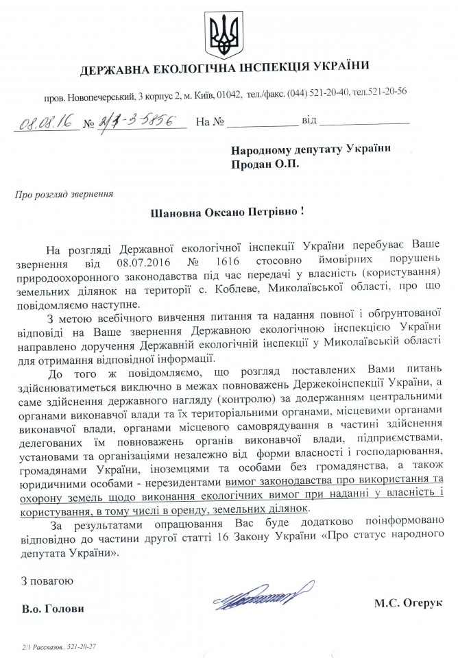 31Сер Коментування вимкнено Відповідь Державної екологічної інспекції України на депутатське звернення щодо можливих порушень земельного законодавства при передачі земельних ділянок у користування у Миколаївській області ДЕПУТАТСЬКЕ ЗВЕРНЕННЯ