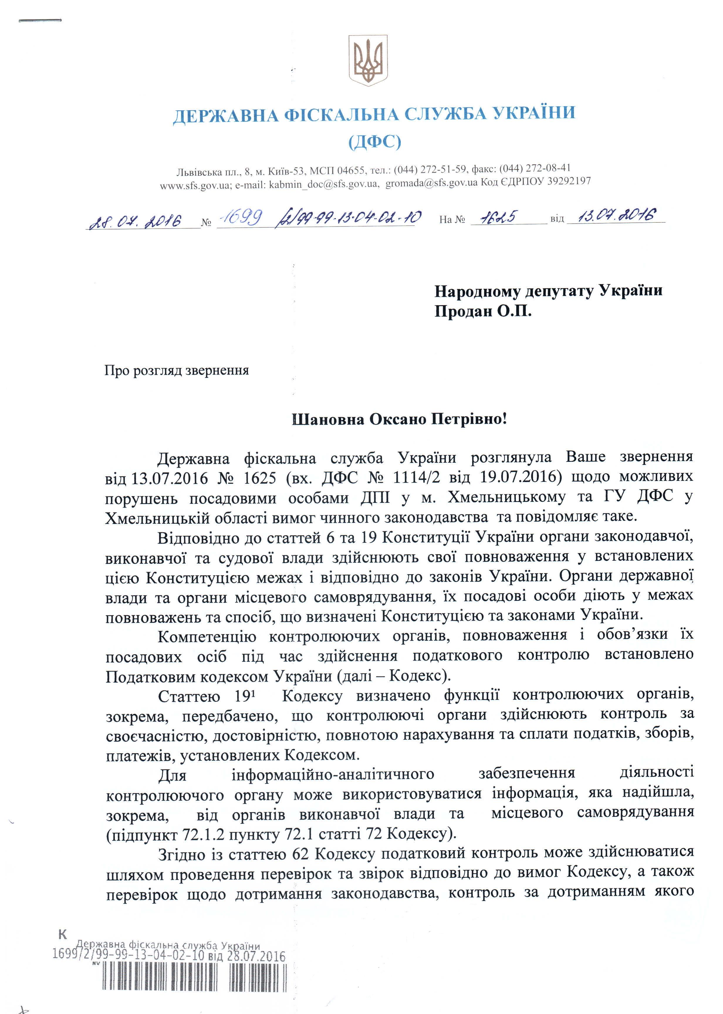 11Сер Коментування вимкнено Відповідь Державної фіскальної служби України на депутатське звернення щодо можливого порушення податкового законодавства посадовими особами ГУ ДФС у Хмельницькій області ДЕПУТАТСЬКЕ ЗВЕРНЕННЯ