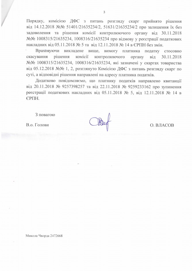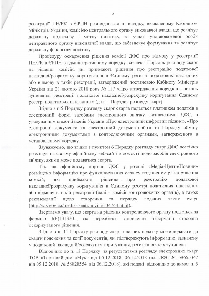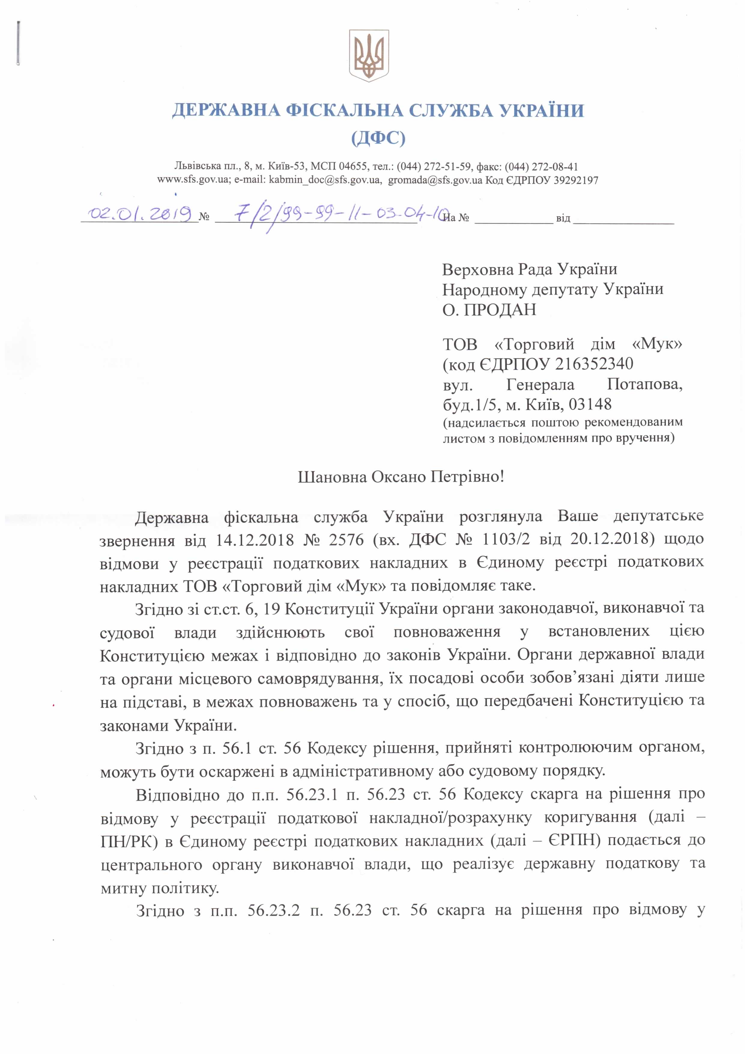 Відповідь Державної фіскальної служби України на депутатське звернення щодо можливого порушення прав ТОВ «Торговий дім «Мук» в частині відмови у реєстрації податкових накладних товариства