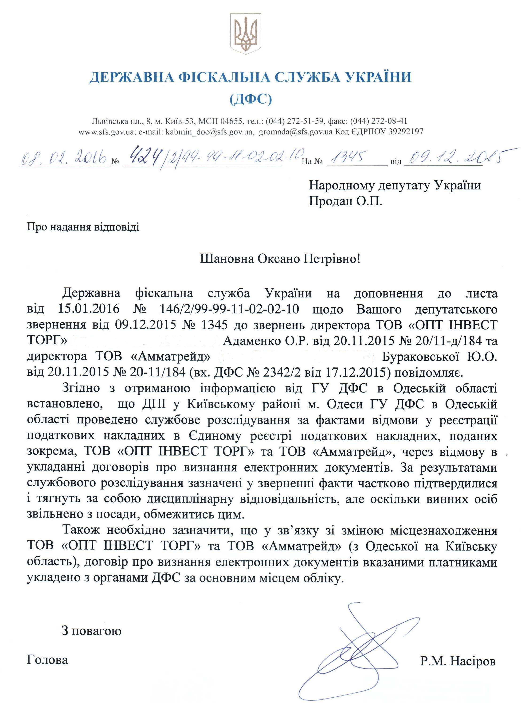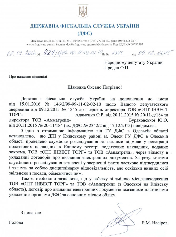 Відповідь Державної фіскальної служби України на депутатське звернення щодо невиконання співробітниками ДПІ у Київському районі м. Одеси ГУ ДФС в Одеській області рішень суду