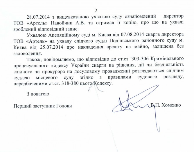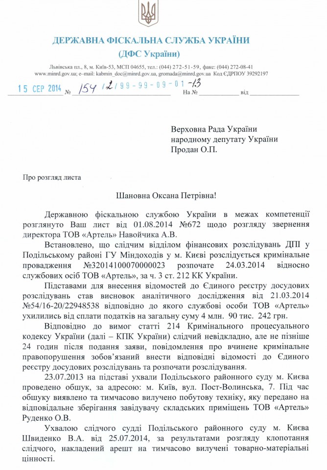 Відповідь Державної фіскальної служби України на депутатське звернення щодо перевірки законності та дотримання вимог законодавства співробітниками СУ ФР ДПІ у Подільському районі ГУ Міндоходів м. Києва