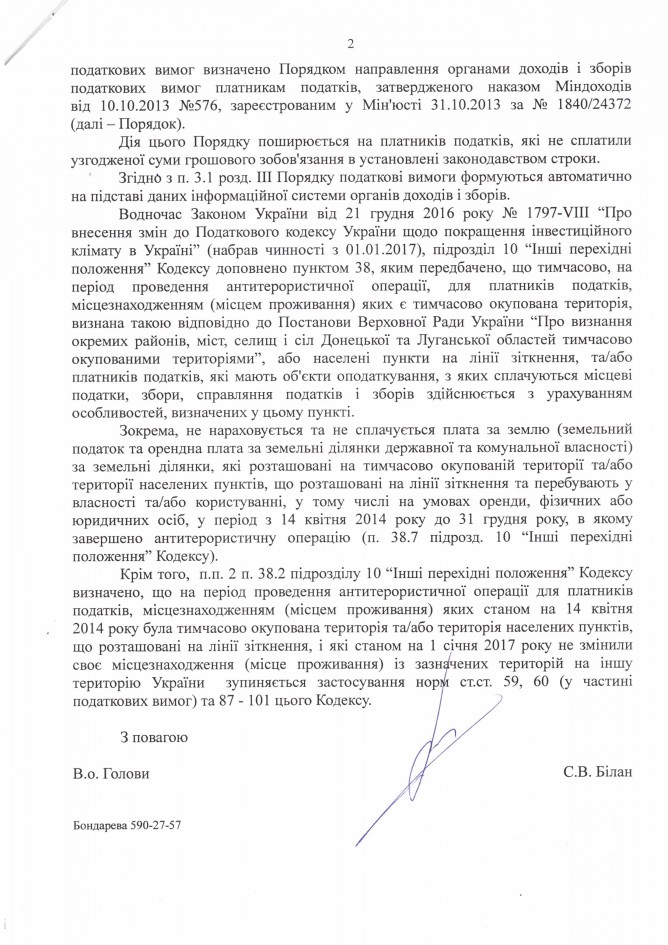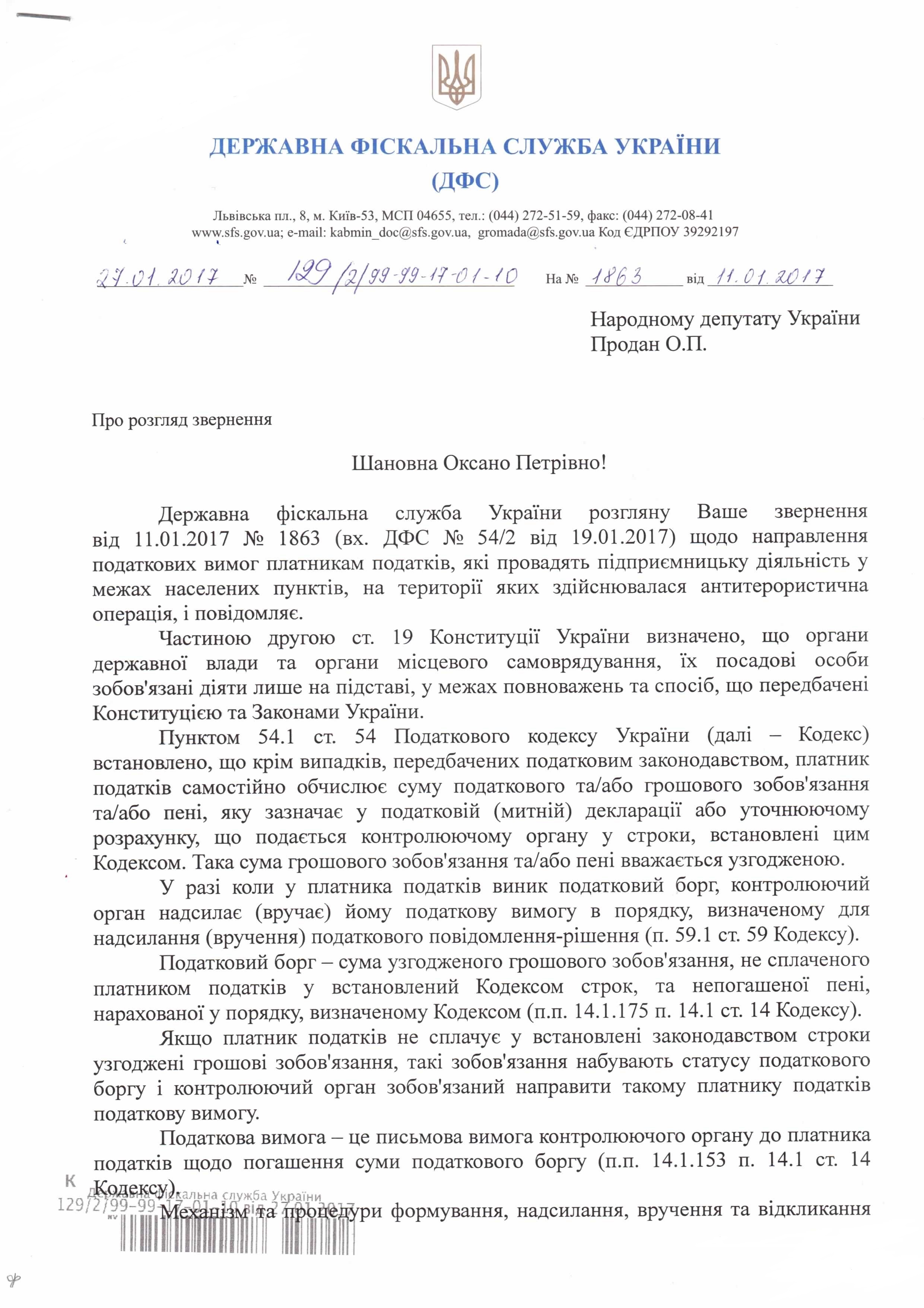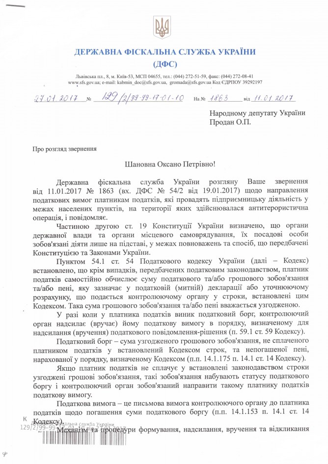 Відповідь Державної фіскальної служби України на депутатське звернення щодо порушення співробітниками територіальних органів ДФС України законодавства та прав підприємців, які здійснюють свою діяльність на території проведення АТО