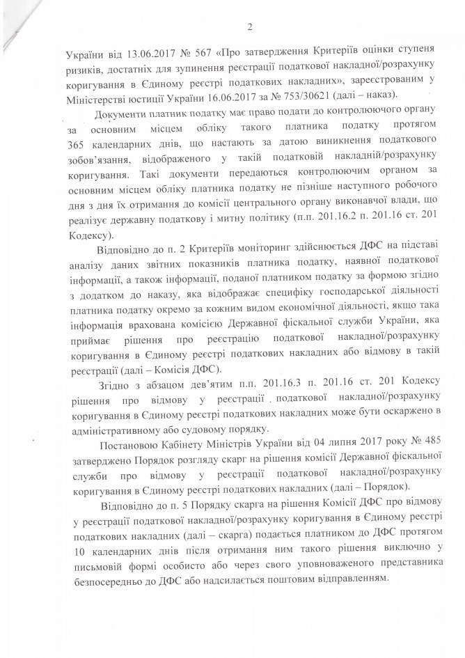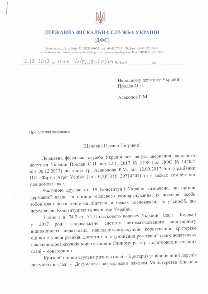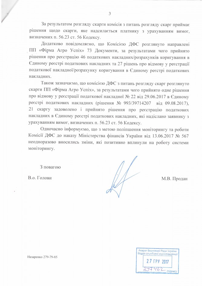 Вхідна документація > Відповідь Державної фіскальної служби України на депутатське звернення щодо рішень комісії ДФС, яка приймає рішення про реєстрацію податкової накладної / розрахунку коригування в Єдиному реєстрі податкових накладних або відмову в такій реєстрації