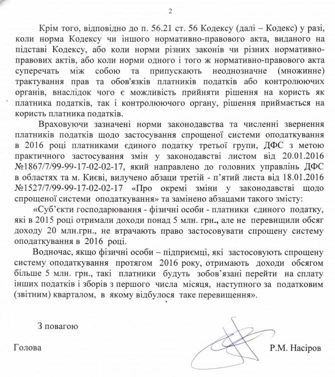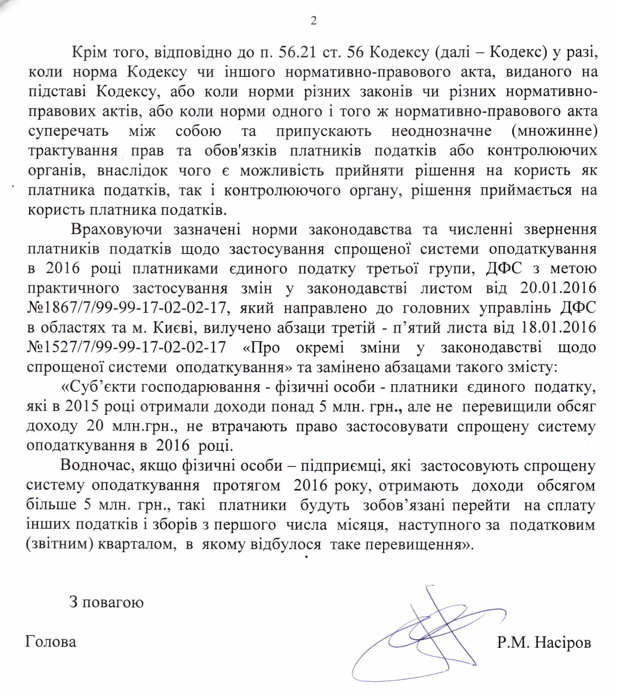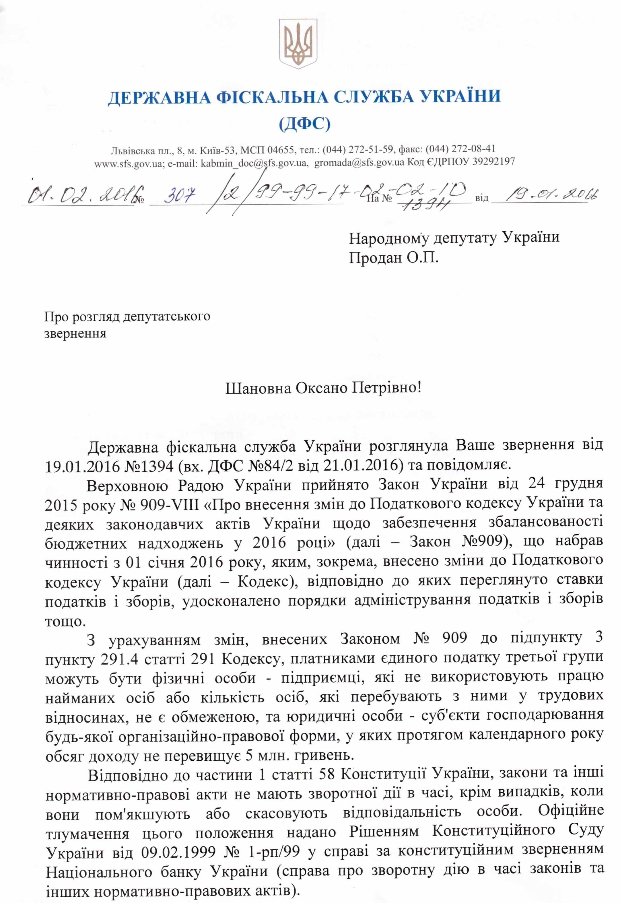 Вхідна документація > Відповідь Державної фіскальної служби України на депутатське звернення щодо відкликання листа ДФС України від 18.01.2016 року №1527/7/99-99-17-02-02-17 «Про окремі зміни у законодавстві щодо спрощеної системи оподаткування»