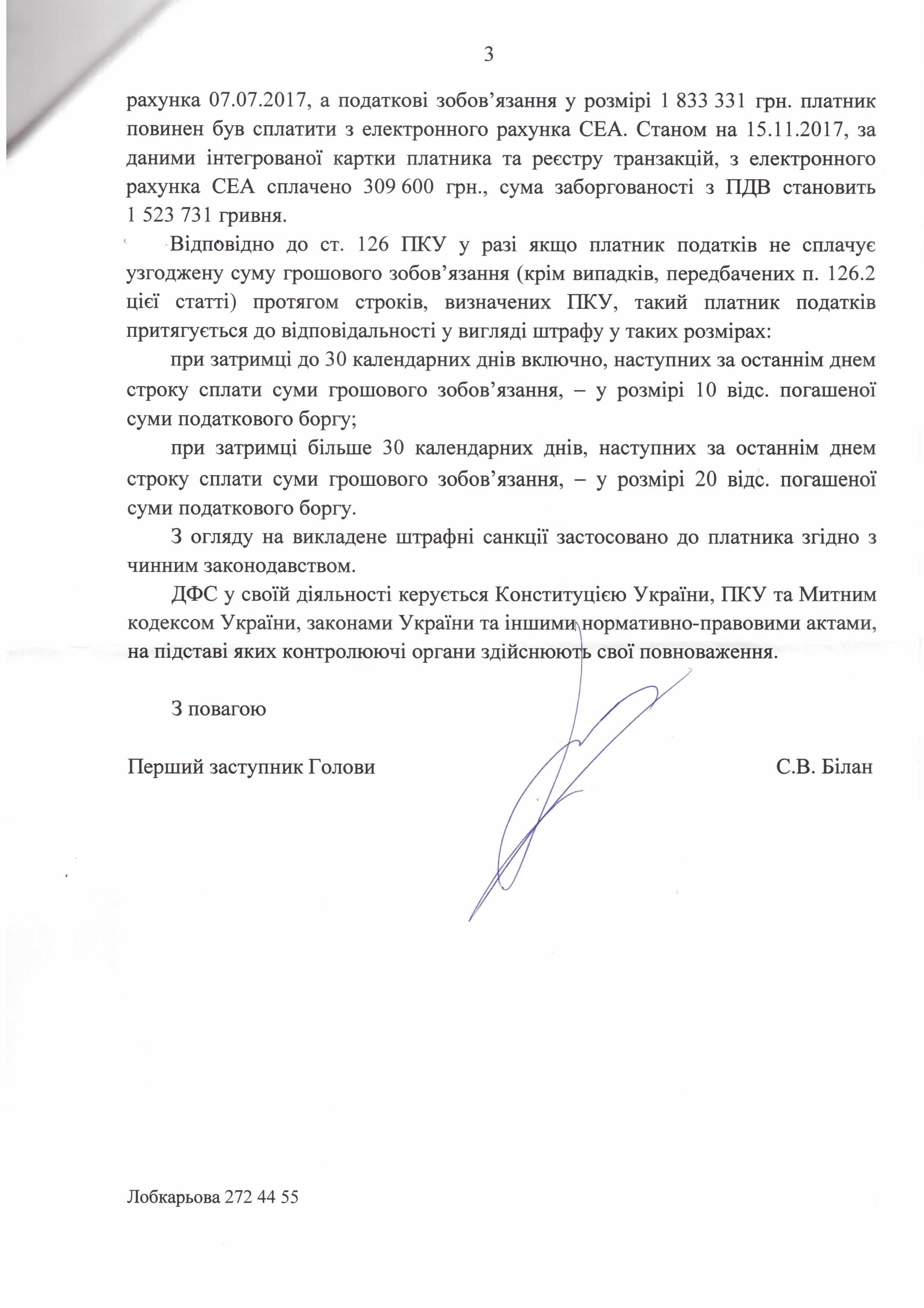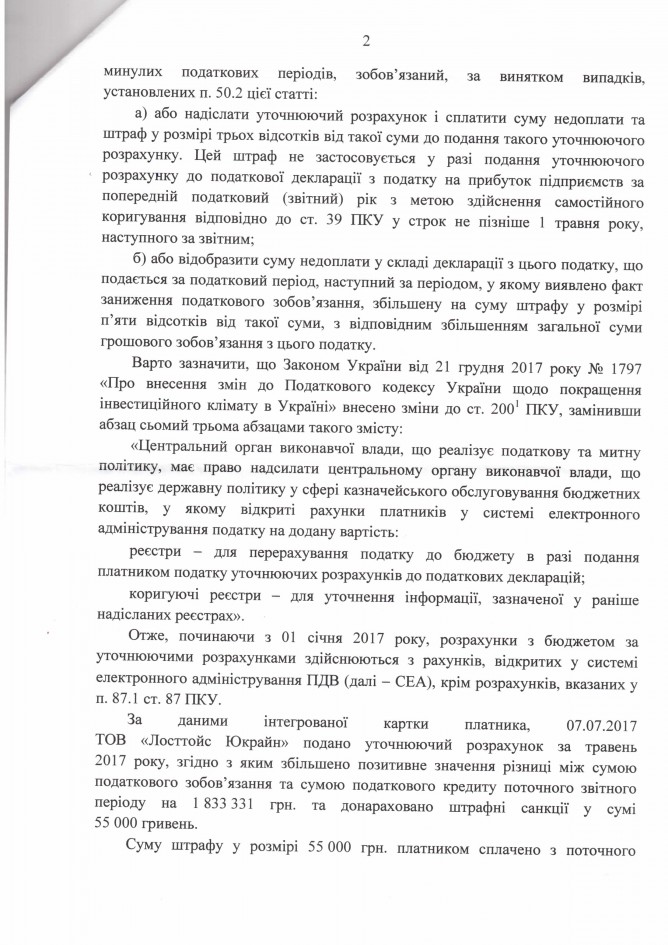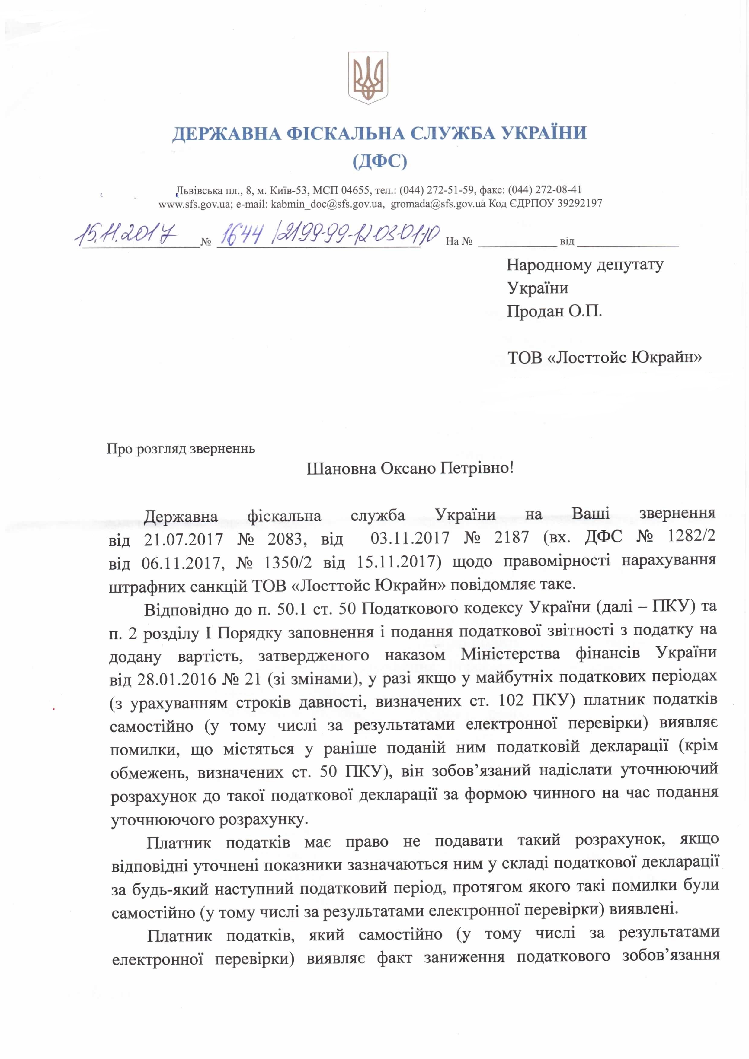 Відповідь Державної фіскальної служби України на депутатські звернення щодо правомірності нарахування штрафних санкцій