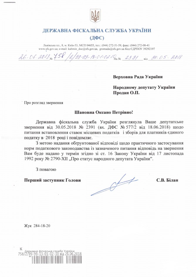 27Лип Коментування вимкнено Відповідь Державної фіскальної служби України на депутатське звернення щодо застосування ставок місцевих податків і зборів Вараською міською радою ДЕПУТАТСЬКЕ ЗВЕРНЕННЯ