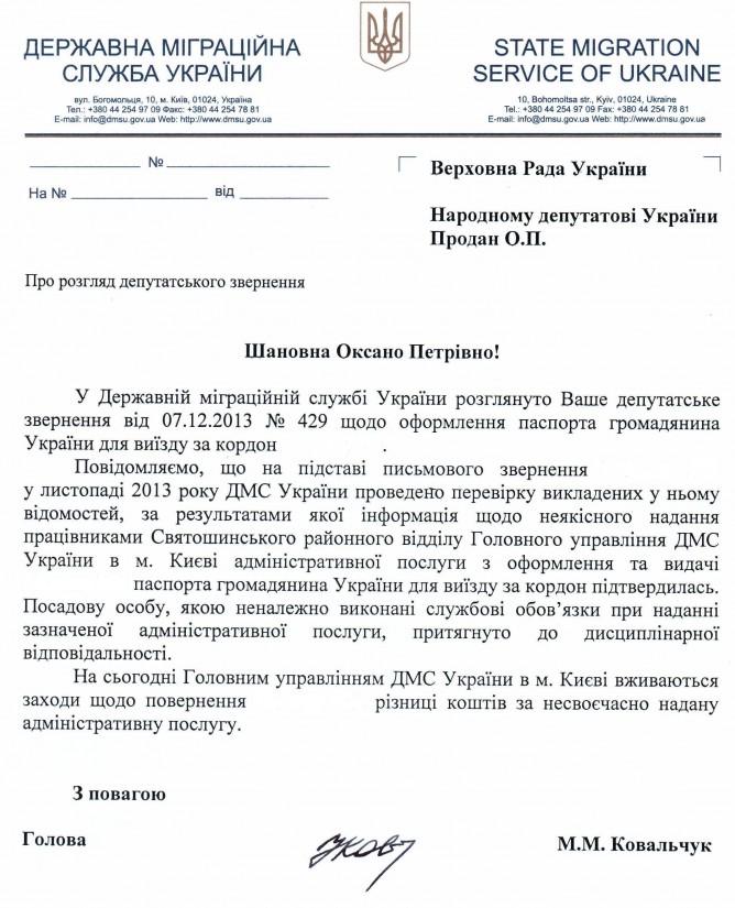 Головна > Верховна Рада України > Вхідна документація > Відповідь Державної міграційної служби України щодо притягнення до дисциплінарної відповідальності за неналежне надання адміністративних послуг підрозділами ДМС України