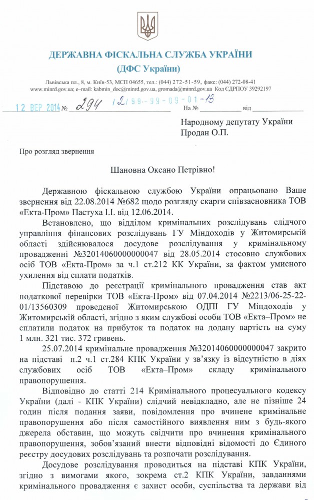 13Жов Коментування вимкнено Відповідь Державної фіскальної служби України на депутатське звернення щодо перевірки законності дій слідчого управління фінансових розслідувань ГУ Міндоходів у Житомирській області ДЕПУТАТСЬКЕ ЗВЕРНЕННЯ