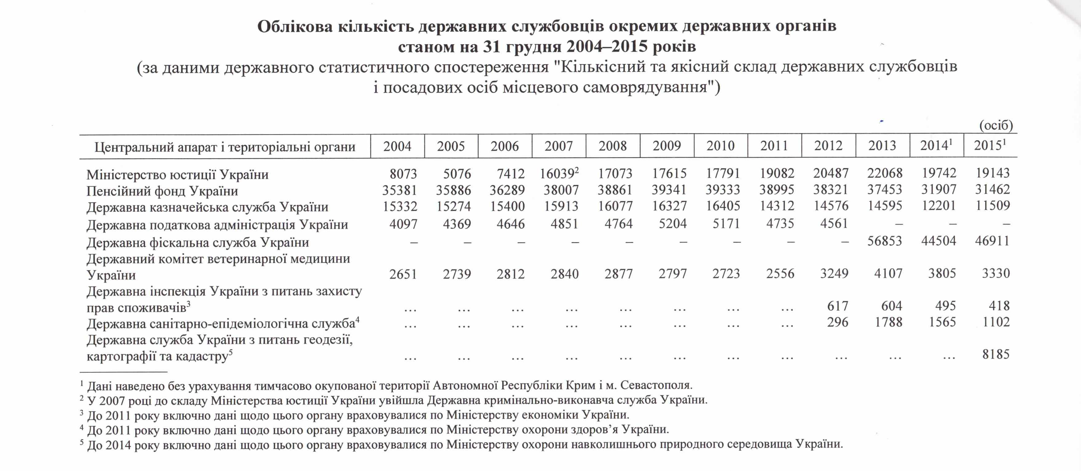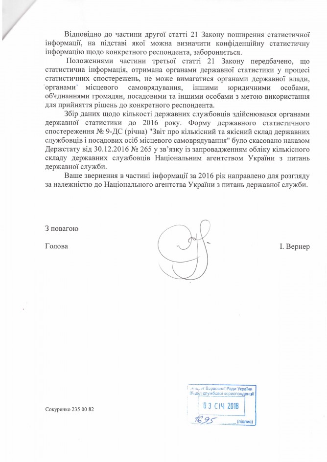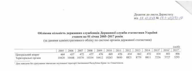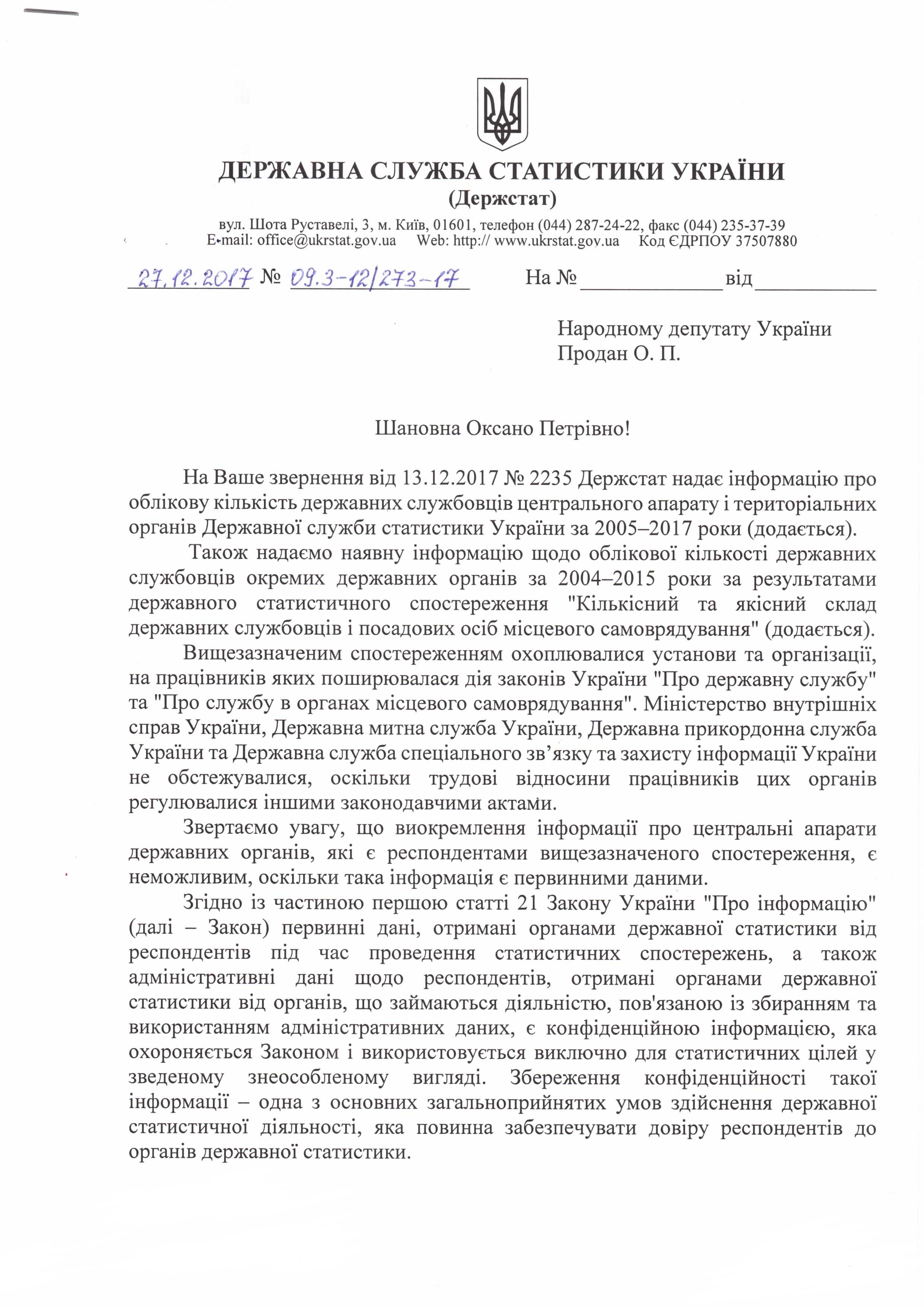 Вхідна документація > Відповідь Державної служби статистики України на депутатське звернення щодо надання інформації про чисельність посадових осіб, які працюють в центральних органах виконавчої влади, інших державних органах