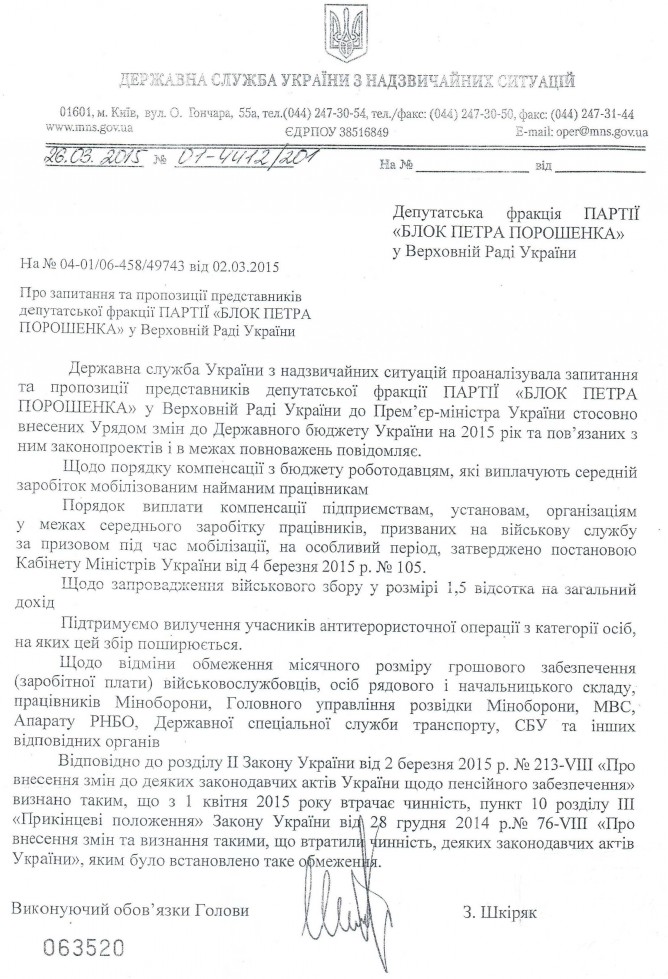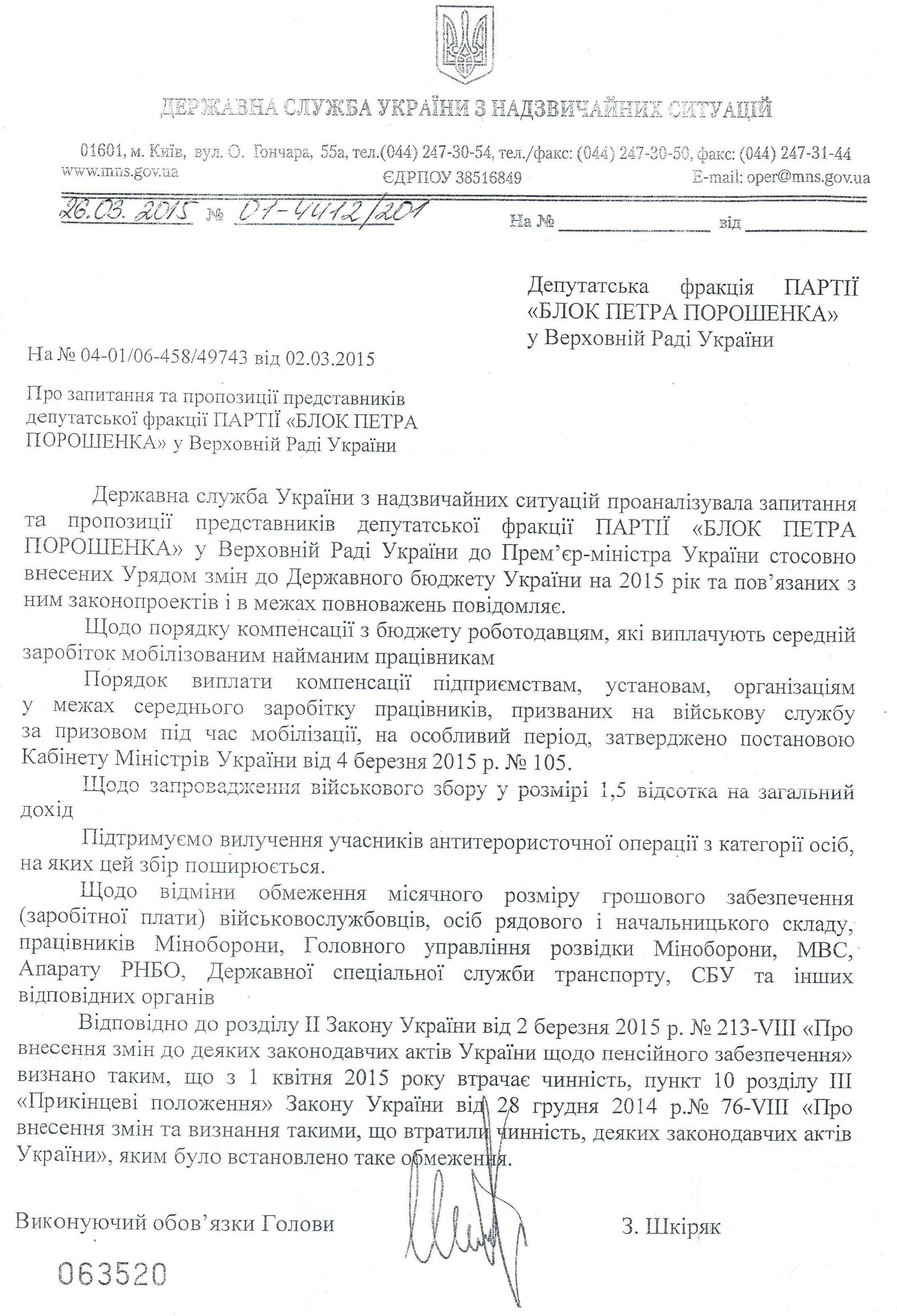 Вхідна документація > Відповідь Державної служби України з надзвичайних ситуацій на запитання депутатів щодо компенсацій виплати заробітної плати мобілізованим працівникам, скасування військового збору для учасників АТО, граничного розміру грошового забезпечення військовослуюбовців