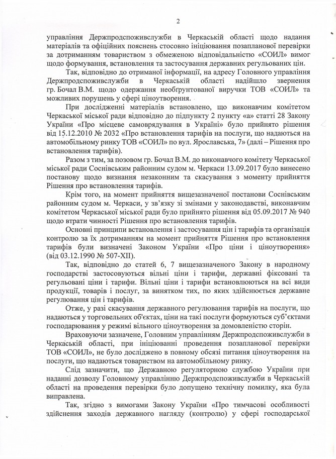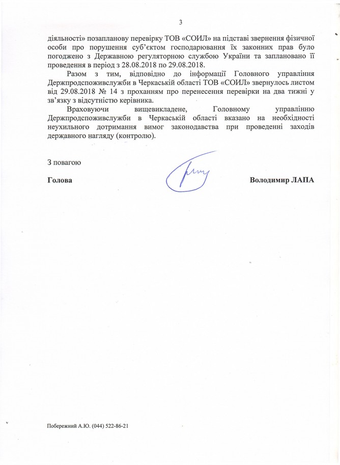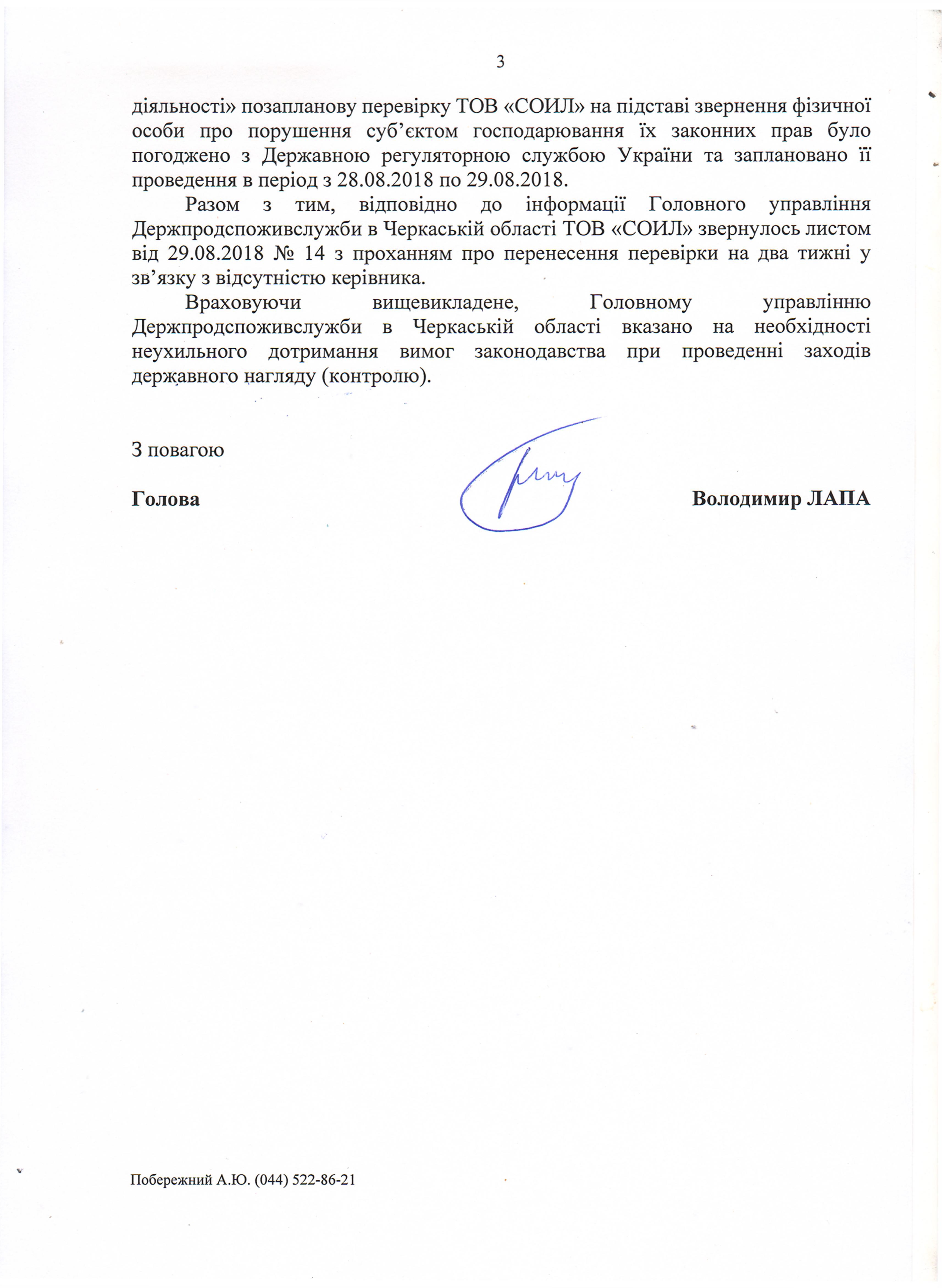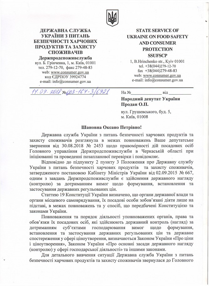 Вхідна документація > Відповідь Державної служби України з питань безпечності харчових продуктів та захисту споживачів на депутатське звернення щодо перевищення повноважень посадовими особами територіальних підрозділів Держпродспоживслужби в Черкаській та у Херсонській областях