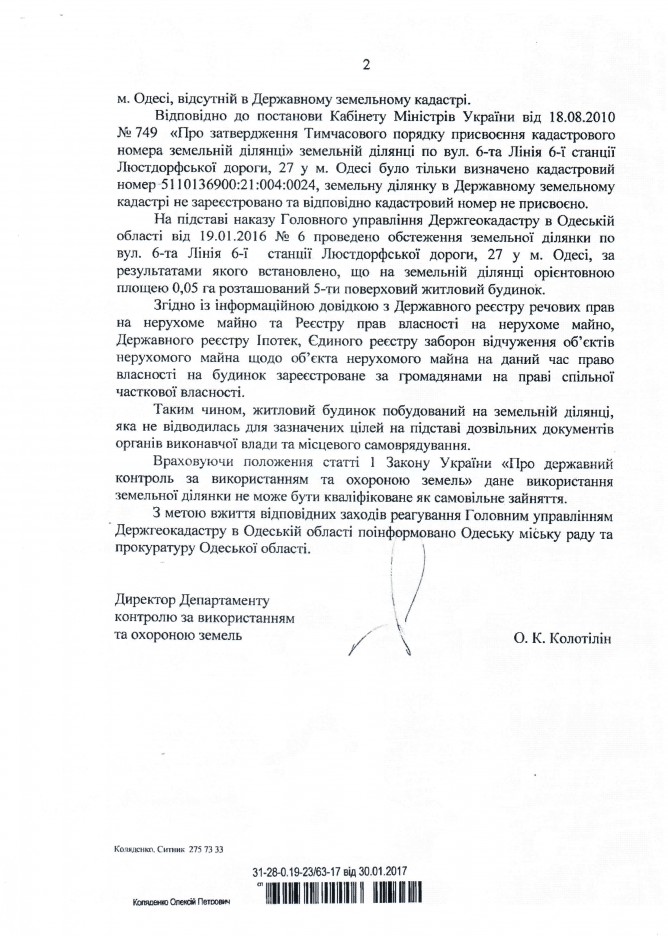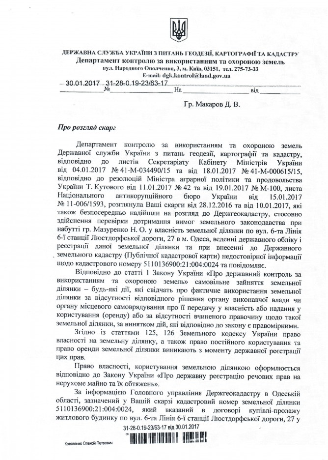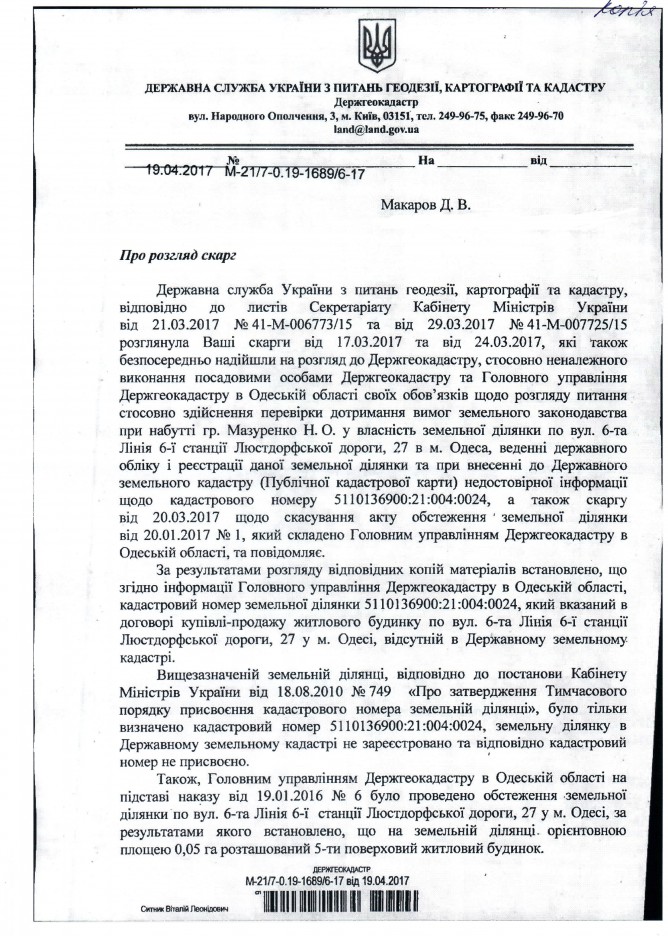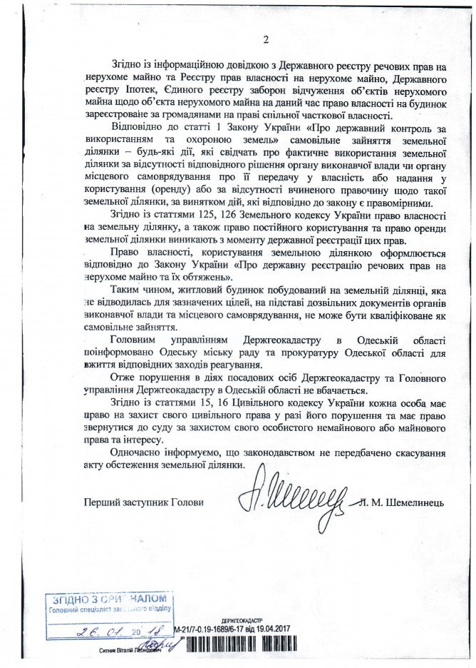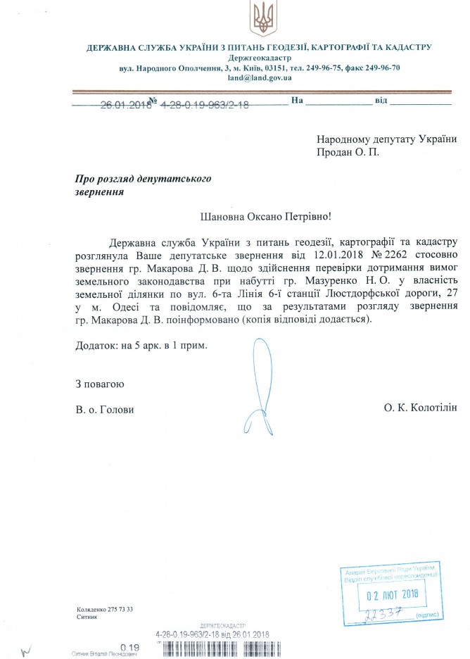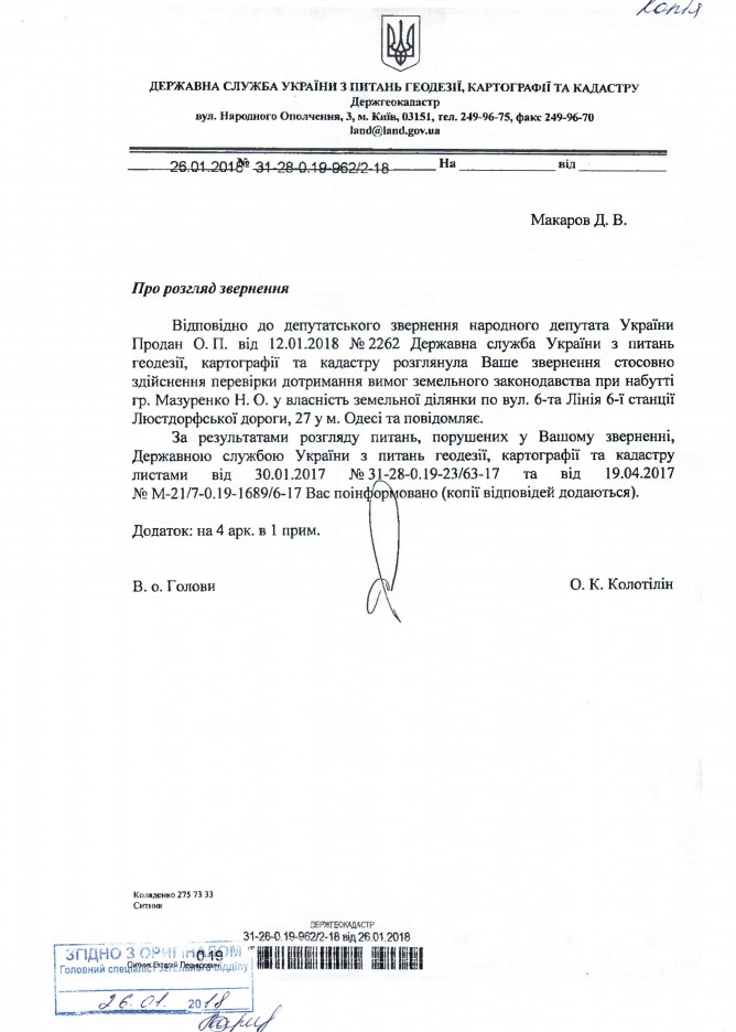 Вхідна документація > Відповідь Державної служби України з питань геодезії, картографії та кадастру на депутатське звернення щодо можливого порушення земельного законодавства при набутті у власність земельної ділянки для здійснення будівництва багатоквартирного будинку у м. Одеса
