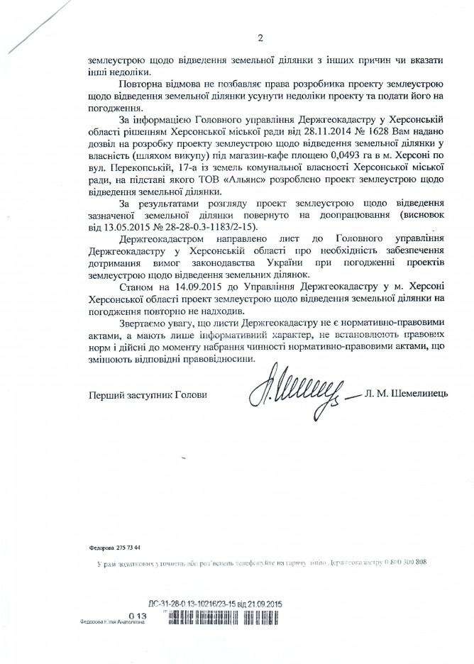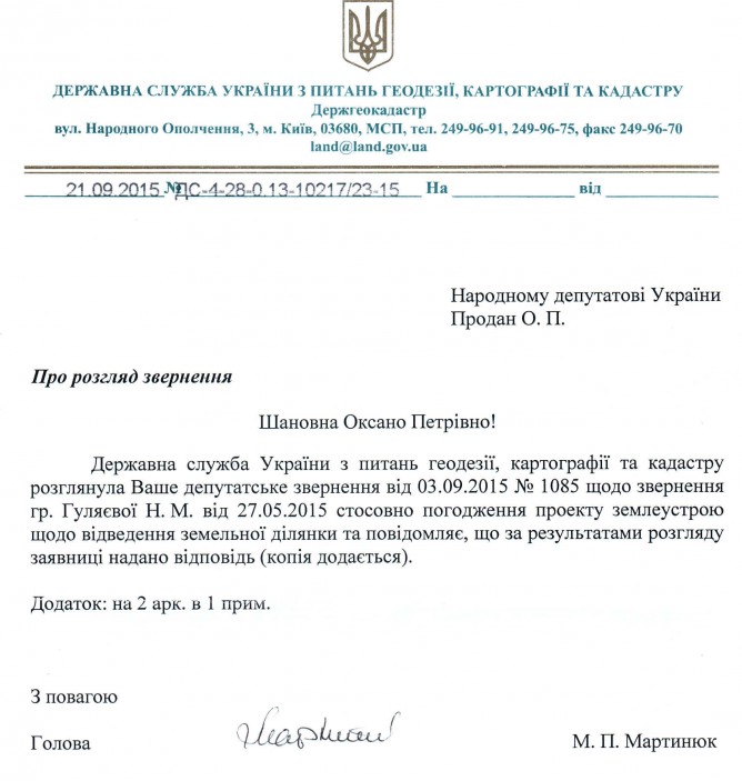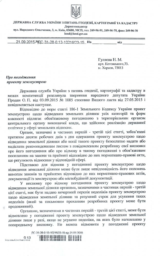 Вхідна документація > Відповідь Державної служби України з питань геодезії, картографії та кадастру на депутатське звернення щодо перешкоджання підприємницькій діяльності Управлінням Держземагентства у м. Херсоні Херсонської області
