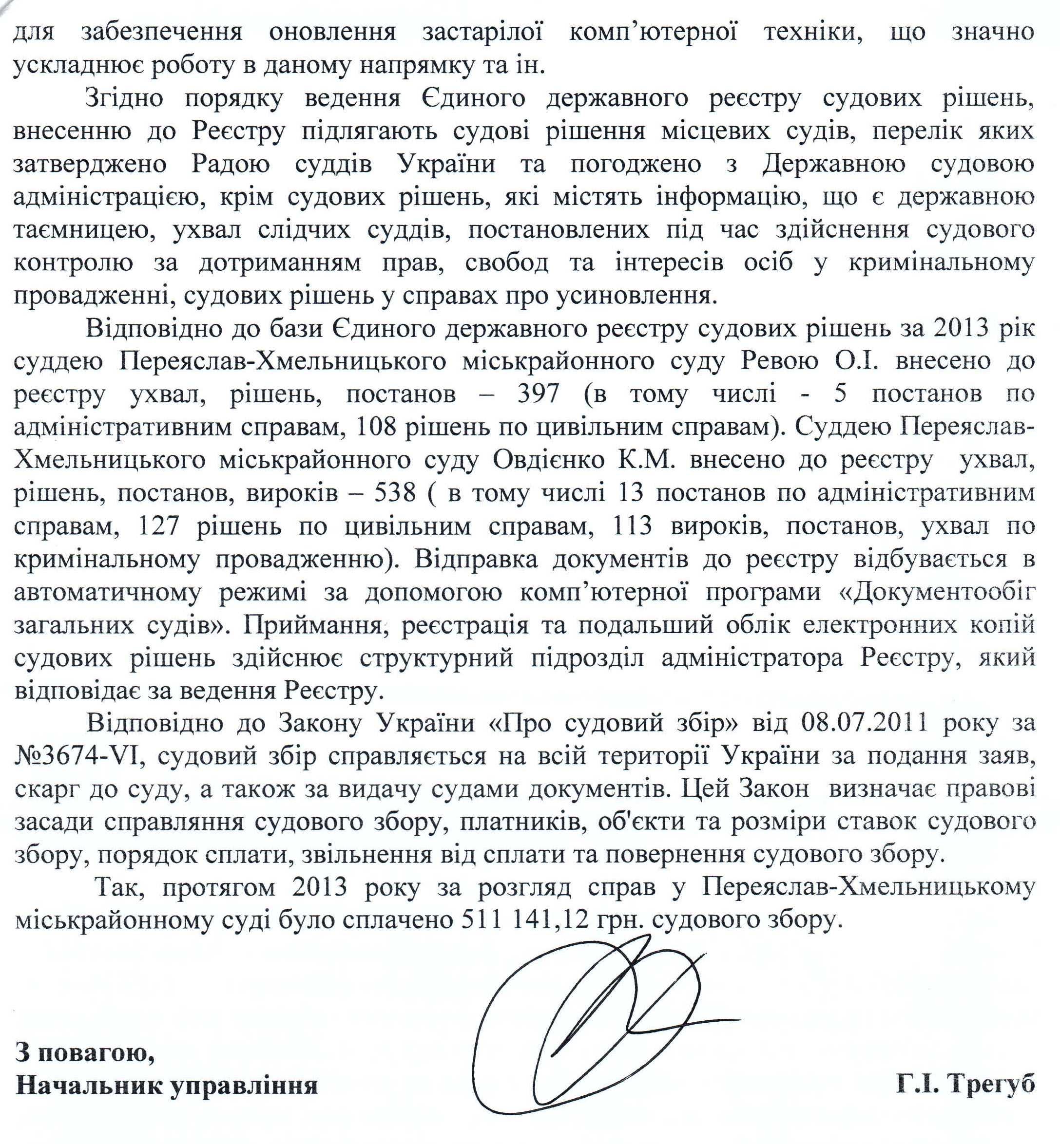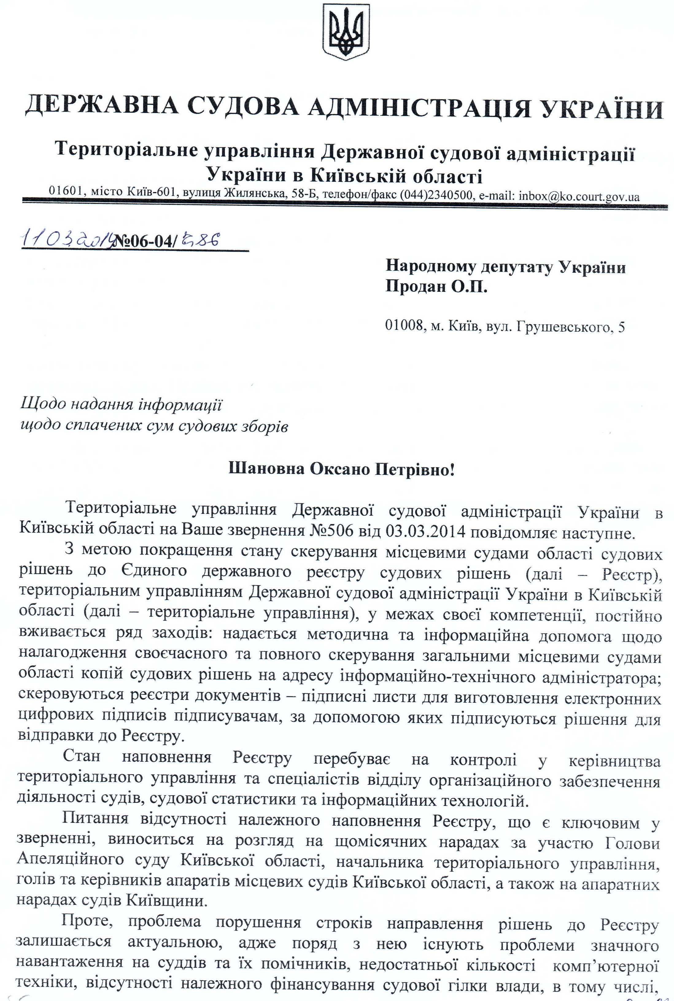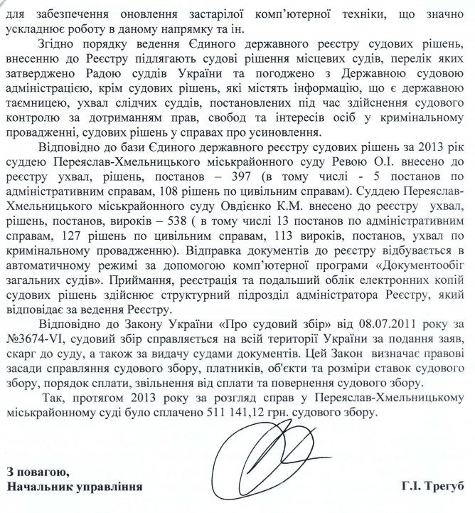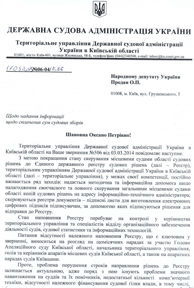 Відповідь Державної судової адміністрації України на депутатське звернення щодо внесення до Єдиного державного реєстру рішень суддями Переяслав-Хмельницького міськрайонного суду