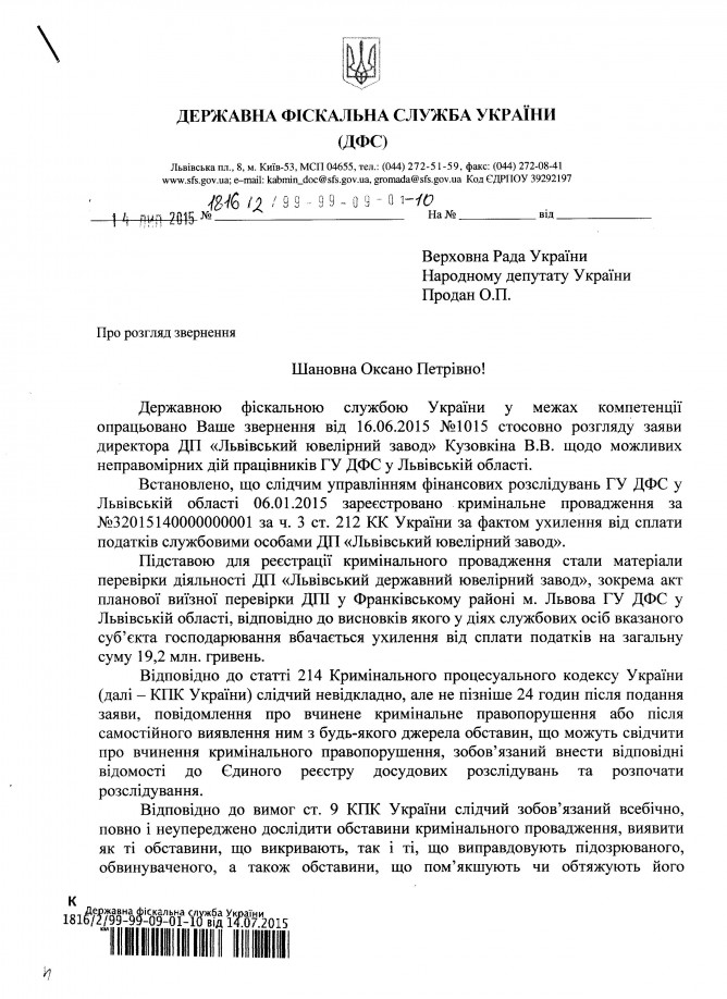 31Лип Коментування вимкнено Відповідь ДФС України на депутатське звернення щодо можливих неправомірних дій працівників ГУ ДФС у Львівській області