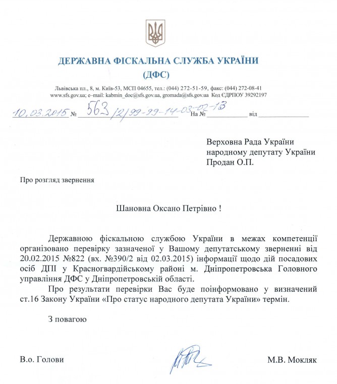 17Кві Коментування вимкнено Відповідь ДФС України на депутатське звернення щодо перевірки законності дій посадових осіб ДПІ у Красногвардійському районі м. Дніпропетровська ГУ ДФС у Дніпропетровській області