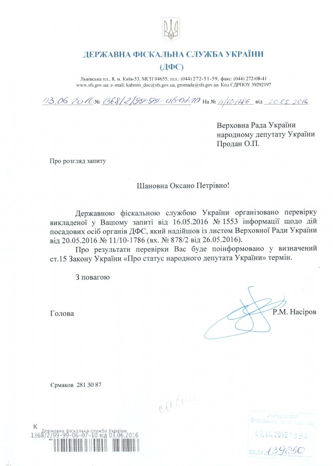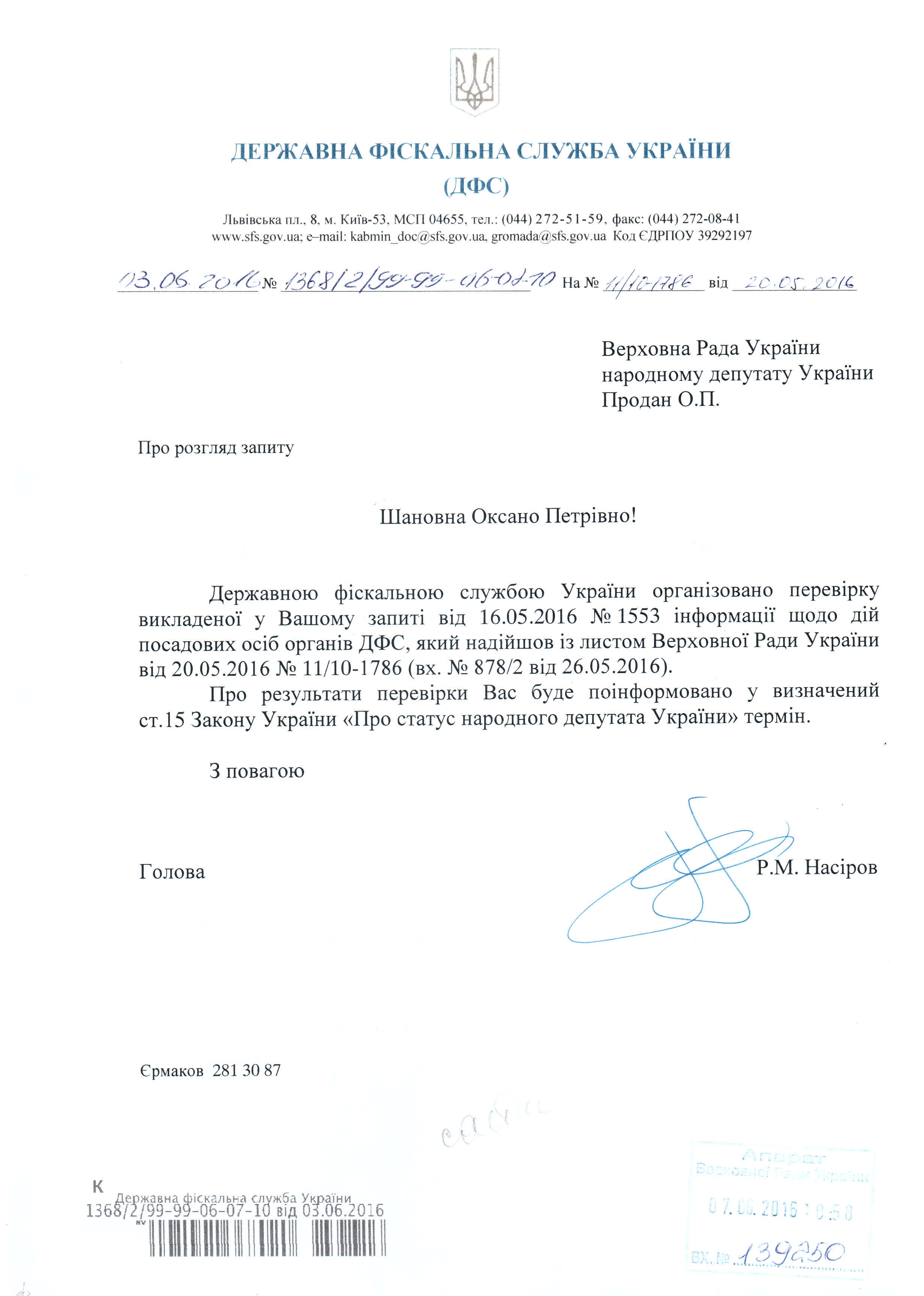 Відповідь ДФС України на депутатське звернення щодо правомірності дій посадових осіб органів ДФС