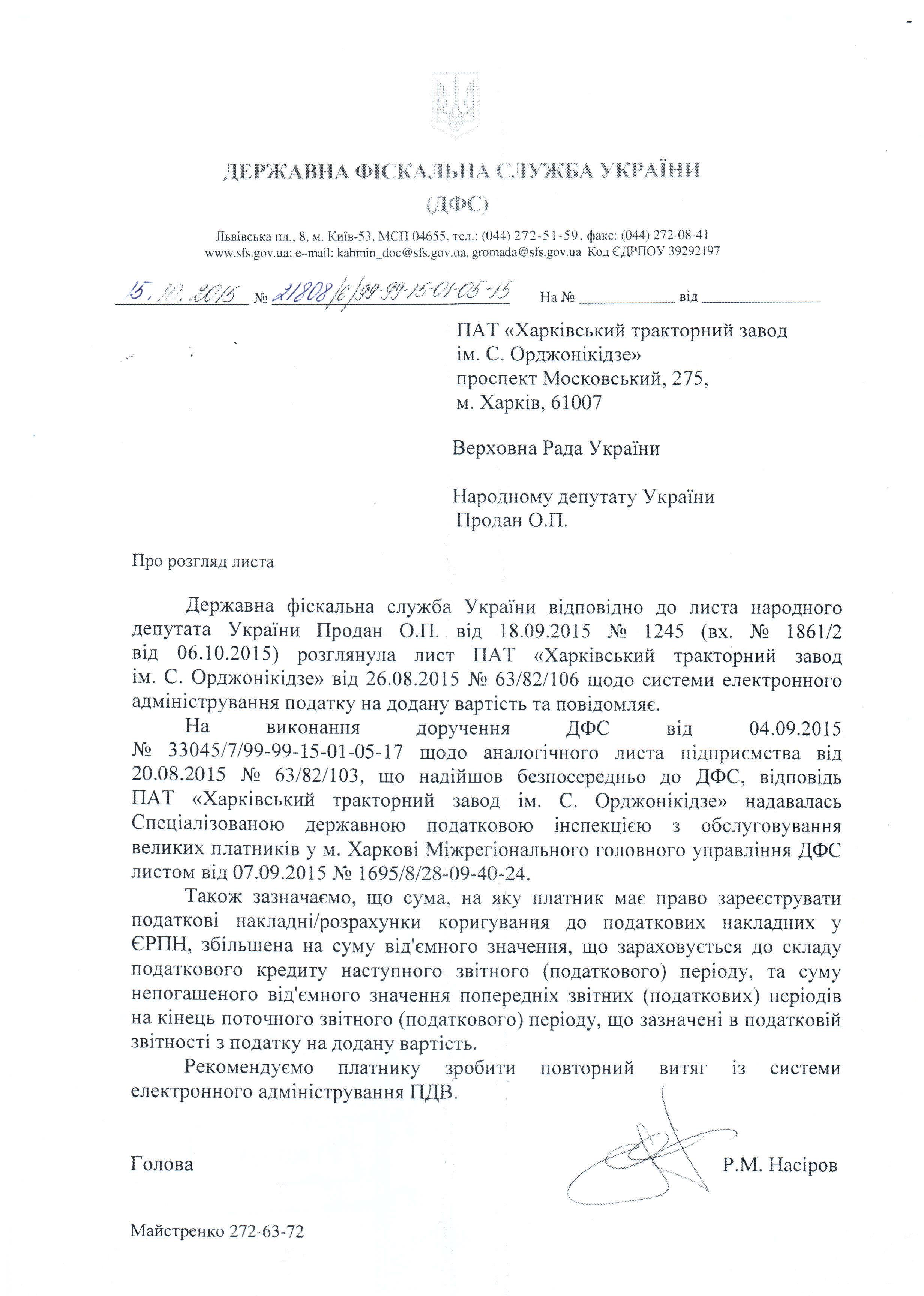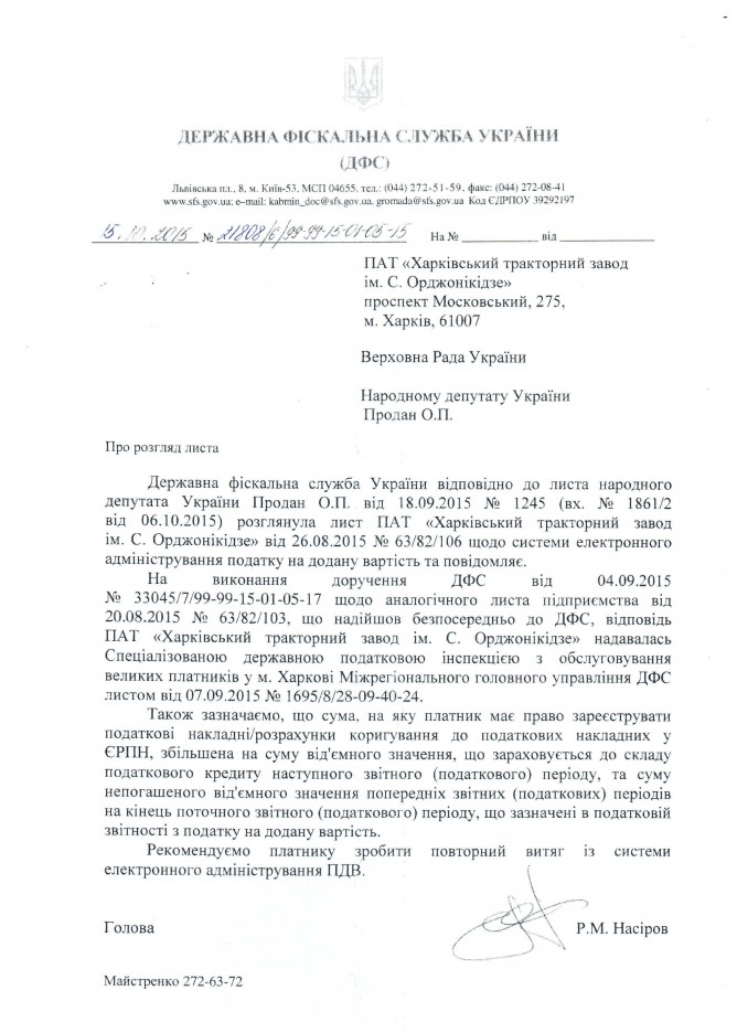 Відповідь ДФС України на депутатське звернення щодо забезпечення можливості ПАТ «Харківський тракторний завод ім. С.Орджонікідзе» здійснювати реєстрацію податкових накладних у системі електронного адміністрування ПДВ