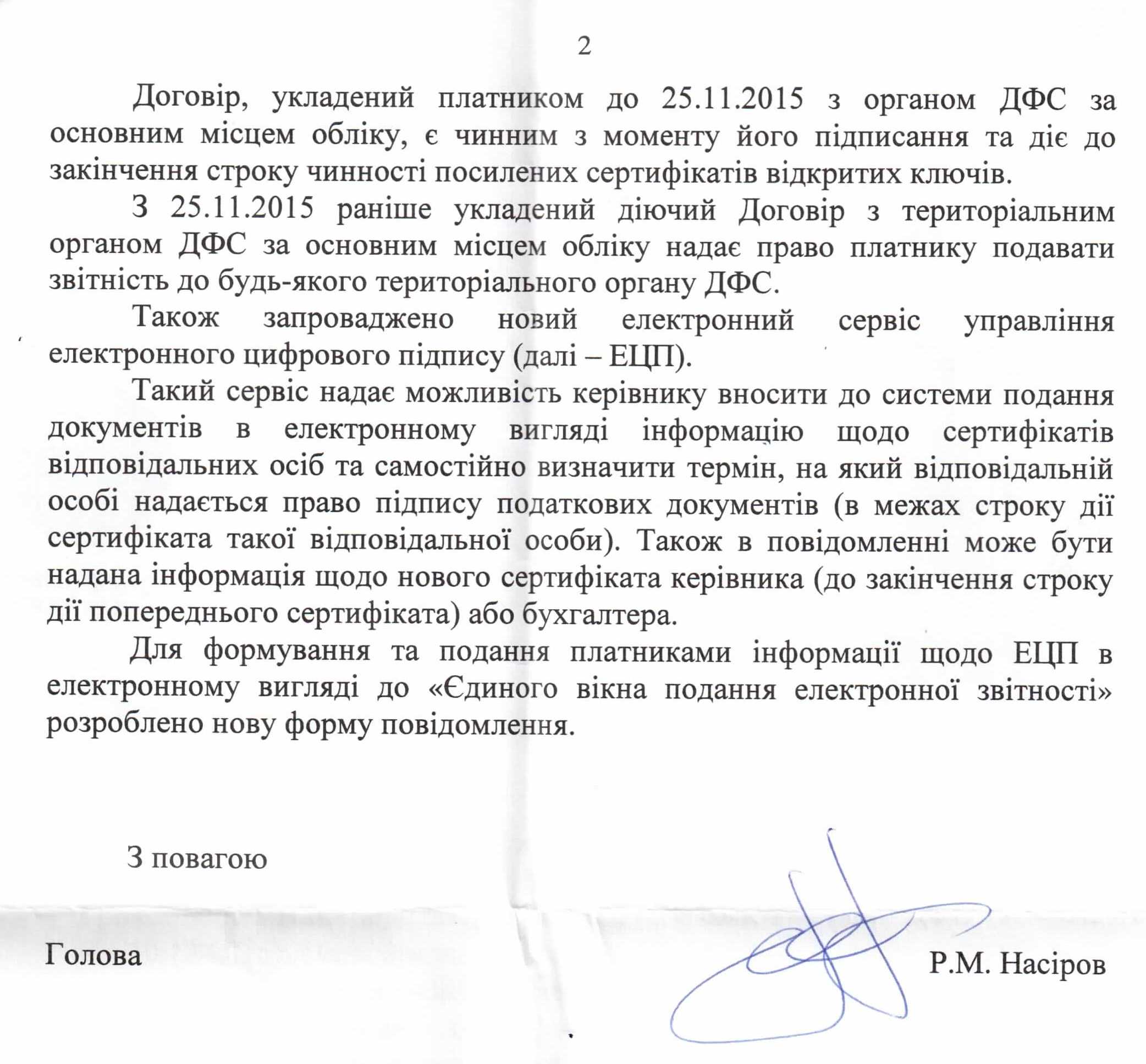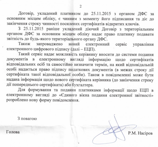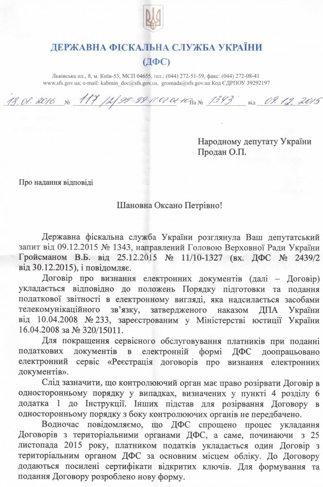 Вхідна документація > Відповідь ДФС України на депутатський запит щодо припинення порушень прав платників податків в частині розірвання органами ДФС в односторонньому порядку договорів про визнання електронних документів